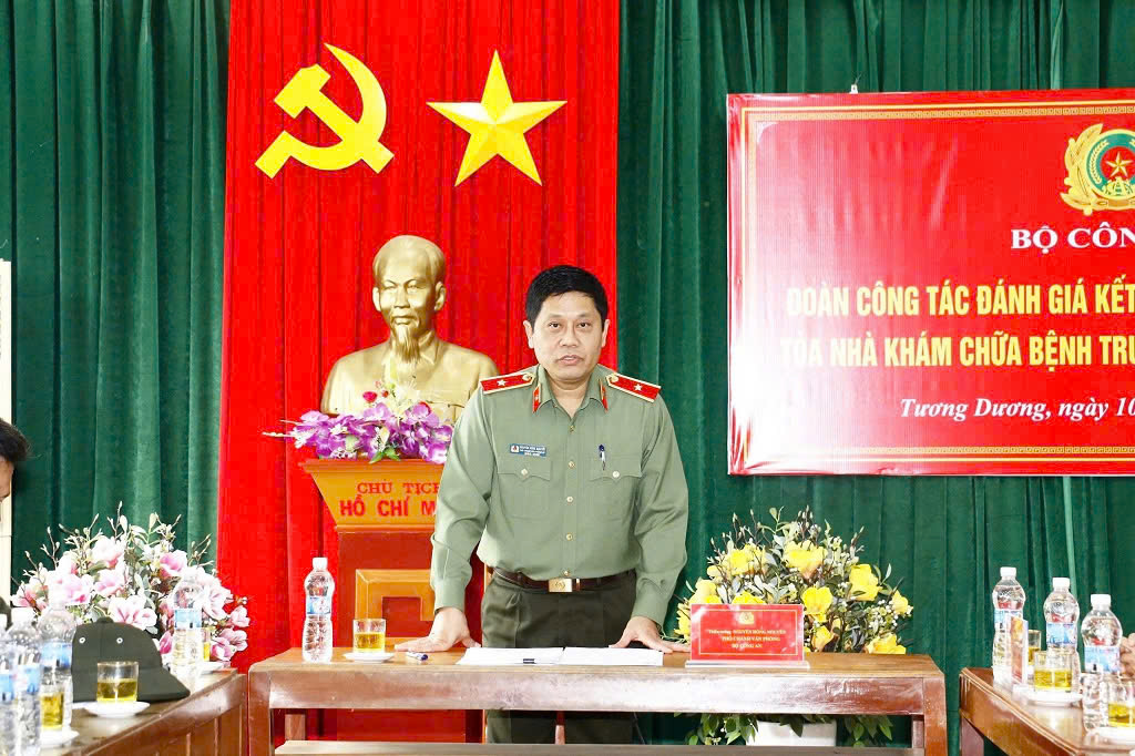 | Đồng chí Thiếu tướng Nguyễn Hồng Nguyên, Phó Chánh Văn phòng Bộ Công an kết luận tại buổi làm việc kiểm tra tiến độ xây dựng Trung tâm Y tế Tương Dương |