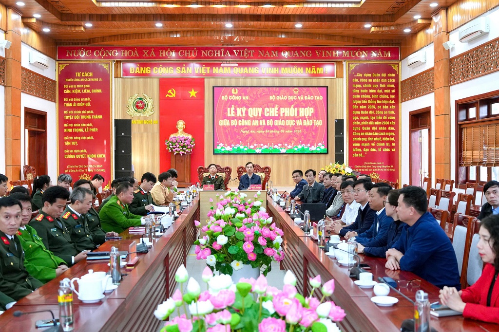 (Congan.nghean.gov.vn)-Chiều 10/01/2026, tại Hà Nội, Bộ Công an và Bộ Giáo dục và Đào tạo (GD&ĐT) ký kết Quy chế phối hợp công tác. Đồng chí Đại tướng Lương Tam Quang, Ủy viên Bộ Chính trị, Bộ trưởng Bộ Công an và đồng chí Nguyễn Kim Sơn, Ủy viên Trung ương Đảng, Bộ trưởng Bộ GD&ĐT đồng chủ trì buổi lễ.