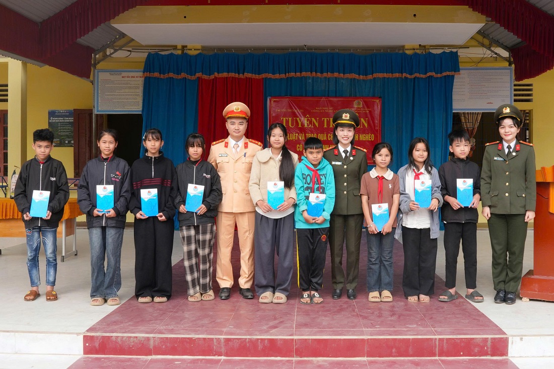 (Congan.nghean.gov.vn)-Phát huy tinh thần thi đua “Ba Nhất”, nhân dịp Tết Nguyên đán Bính Ngọ năm 2026, ngày 30/01/2026, tại xã Môn Sơn, tỉnh Nghệ An, Ban Phụ nữ Công an tỉnh phối hợp Đội Cảnh sát giao thông (CSGT) đường bộ số 2 - Phòng CSGT Công an tỉnh tổ chức tuyên truyền pháp luật và tặng quà Tết học sinh có hoàn cảnh khó khăn; đồng thời thăm, tặng quà 02 em là “con đỡ đầu”.