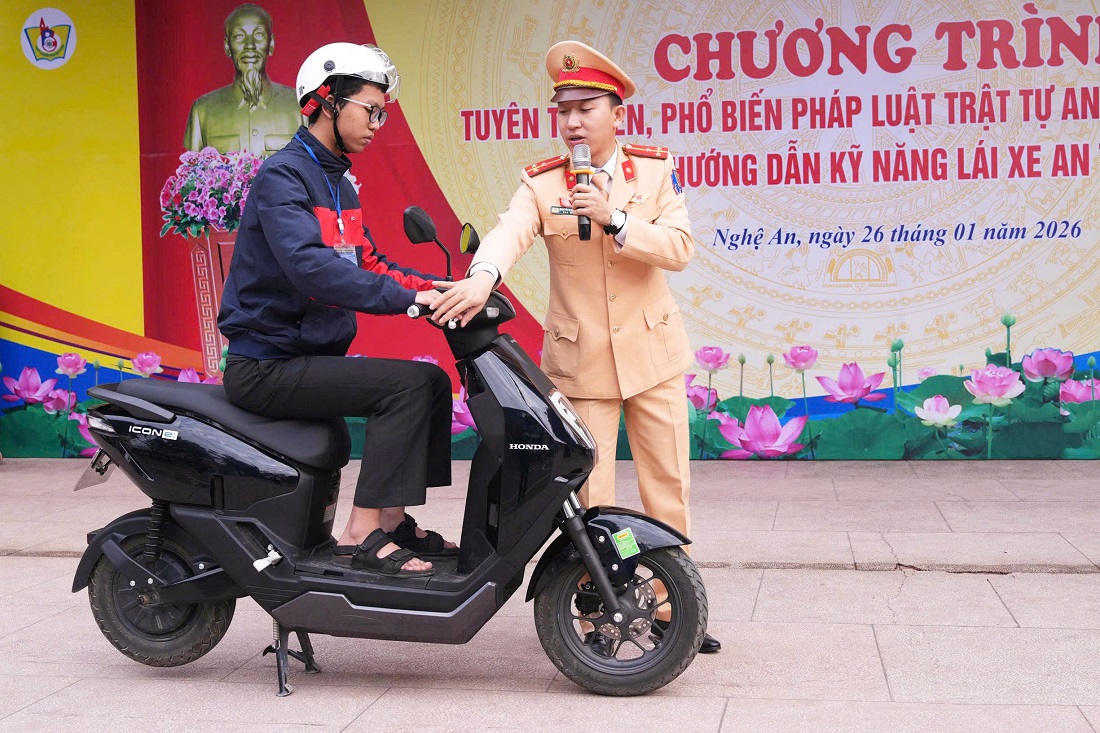 (Congan.nghean.gov.vn)-Nhằm nâng cao nhận thức, ý thức chấp hành pháp luật về trật tự an toàn giao thông (TTATGT) cho học sinh, sáng 26/01/2026, Phòng Cảnh sát giao thông (CSGT) Công an tỉnh phối hợp Trường THPT Chuyên Phan Bội Châu tổ chức Chương trình tuyên truyền, phổ biến pháp luật về TTATGT và hướng dẫn kỹ năng lái xe an toàn cho học sinh toàn trường.