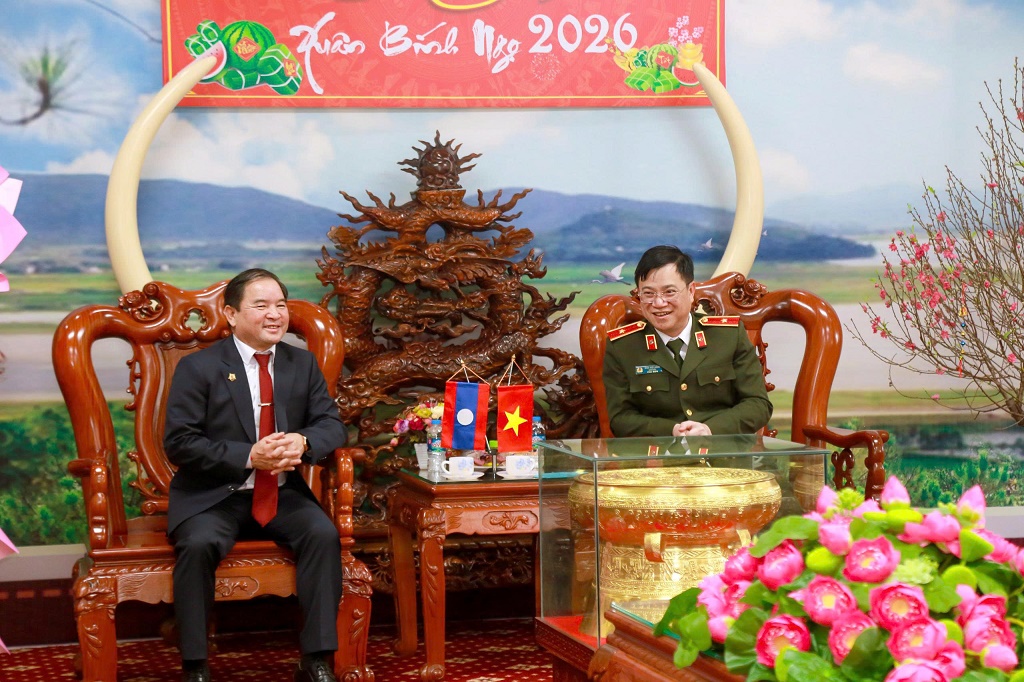 (Congan.nghean.gov.vn)-Nhân dịp đất nước ta chuẩn bị đón Tết cổ truyền Xuân Bính Ngọ 2026, sáng 03/02/2026, Đoàn đại biểu tỉnh Xiêng Khoảng (Nước CHDCND Lào) do đồng chí Bua Ngân Hụm Xay Phạ Nhôm, Tỉnh trưởng tỉnh Xiêng Khoảng làm trưởng đoàn sang thăm và chúc Tết Công an tỉnh Nghệ An. Tiếp đoàn có đồng chí Thiếu tướng Đinh Việt Dũng - Ủy viên Ban Thường vụ Tỉnh ủy, Bí thư Đảng ủy, Giám đốc Công an tỉnh; Đại tá Trần Ngọc Tuấn - Ủy viên Ban Thường vụ Đảng ủy, Phó Giám đốc Công an tỉnh cùng đại diện lãnh đạo các phòng Công an tỉnh.