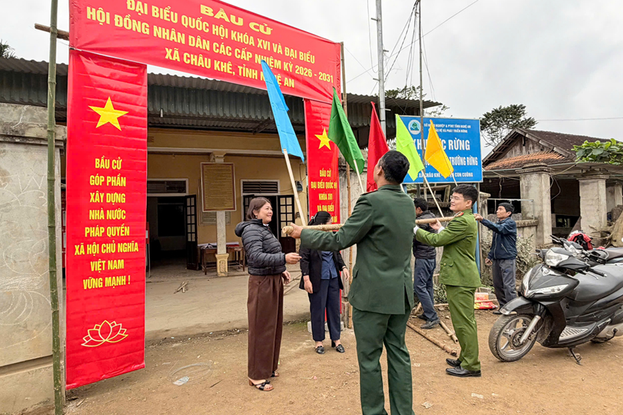 Hướng tới sự kiện chính trị trọng đại - bầu cử đại biểu Quốc hội khóa XVI và đại biểu HĐND các cấp nhiệm kỳ 2026-2031, song song với triển khai phương án bảo đảm an ninh trật tự, Công an xã Châu Khê tích cực phối hợp cùng tổ chức đoàn thể và bà con nhân dân tiến hành dọn dẹp, trang trí khánh tiết tại khu vực bỏ phiếu ở thôn, bản.