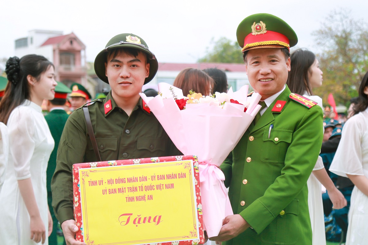 Trong không khí trang trọng của buổi lễ, đồng chí Nguyễn Văn Đệ - Ủy viên Ban Thường vụ Tỉnh ủy, Phó Chủ tịch UBND tỉnh thực hiện nghi thức thắp ngọn lửa truyền thống, khơi dậy niềm tự hào, tinh thần xung kích của tuổi trẻ. Đồng thời gửi gắm niềm tin tới tân binh tiếp tục phát huy truyền thống quê hương cách mạng, nỗ lực rèn luyện, chấp hành nghiêm kỷ luật, phấn đấu hoàn thành xuất sắc nhiệm vụ trong môi trường quân đội và lực lượng Công an nhân dân.