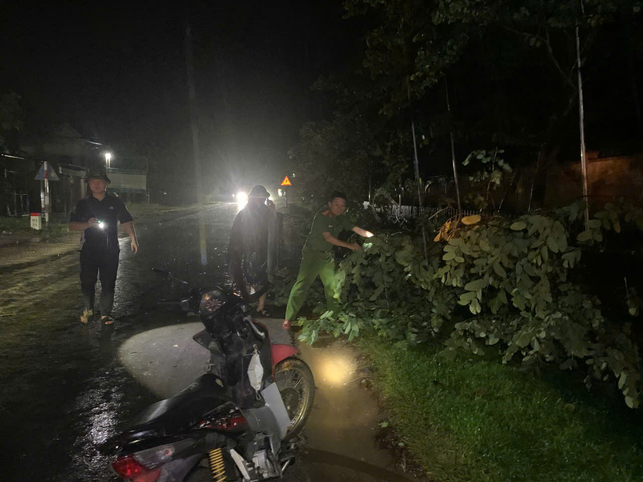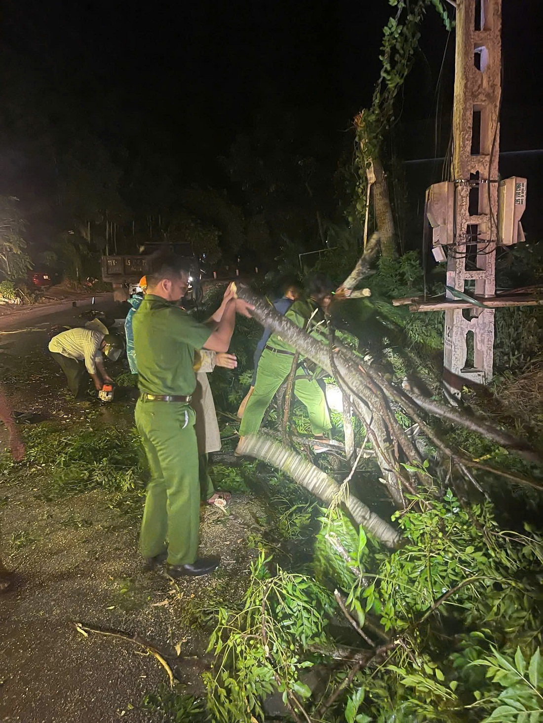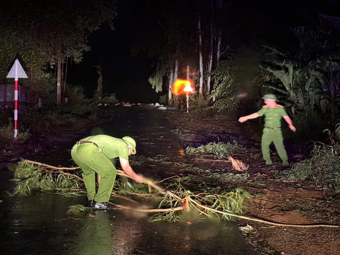 Ngay trong đêm, Công an các xã đã khẩn trương tổ chức ứng trực, kịp thời phối hợp các ban, ngành, đoàn thể, lực lượng ANTT cơ sở cùng Nhân dân có mặt tại các tuyến đường cưa cắt cây cối gãy đổ và dọn dẹp để thông tuyến. Đồng thời hướng dẫn, kiểm tra, tuyên truyền cảnh báo Nhân dân trên địa bàn triển khai các biện pháp bảo đảm an toàn, phòng ngừa, hạn chế đến mức thấp nhất thiệt hại do bão, mưa lũ, sạt lở đất gây ra; kiểm tra, nhắc nhở, vận động ngư dân vào bờ neo đậu tàu thuyền an toàn, di dời người và tài sản khỏi vùng nguy hiểm.