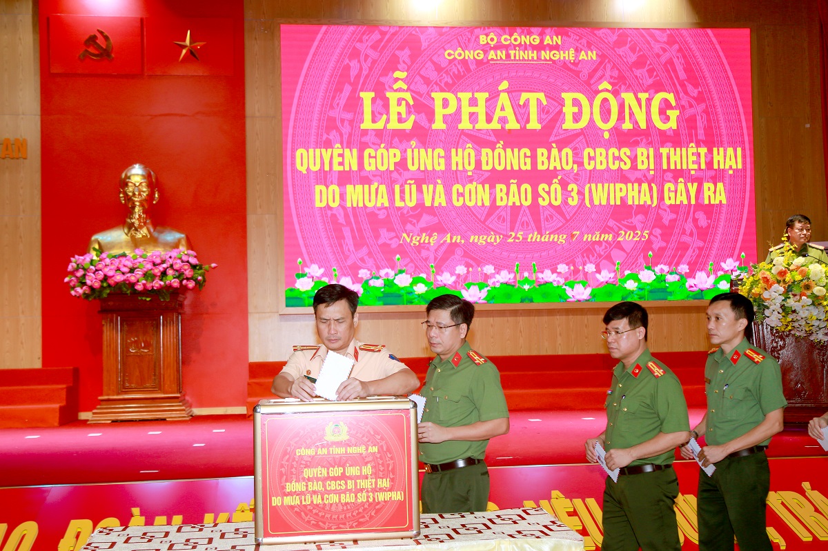(Congan.nghean.gov.vn)-Những ngày vừa qua, do ảnh hưởng của cơn bão số 3 (Wipha), đồng bào các xã miền núi Tây Nghệ An phải hứng chịu nhiều thiệt hại hết sức nặng nề. Hưởng ứng Lời kêu gọi của Ủy ban Mặt trận Tổ quốc Việt Nam tỉnh Nghệ An về việc ủng hộ, giúp đỡ đồng bào khắc phục hậu quả sau mưa lũ, sáng 25/7/2025, Công an tỉnh Nghệ An tổ chức Lễ phát động quyên góp ủng hộ đồng bào, cán bộ, chiến sĩ bị thiệt hại do thiên tai gây ra.