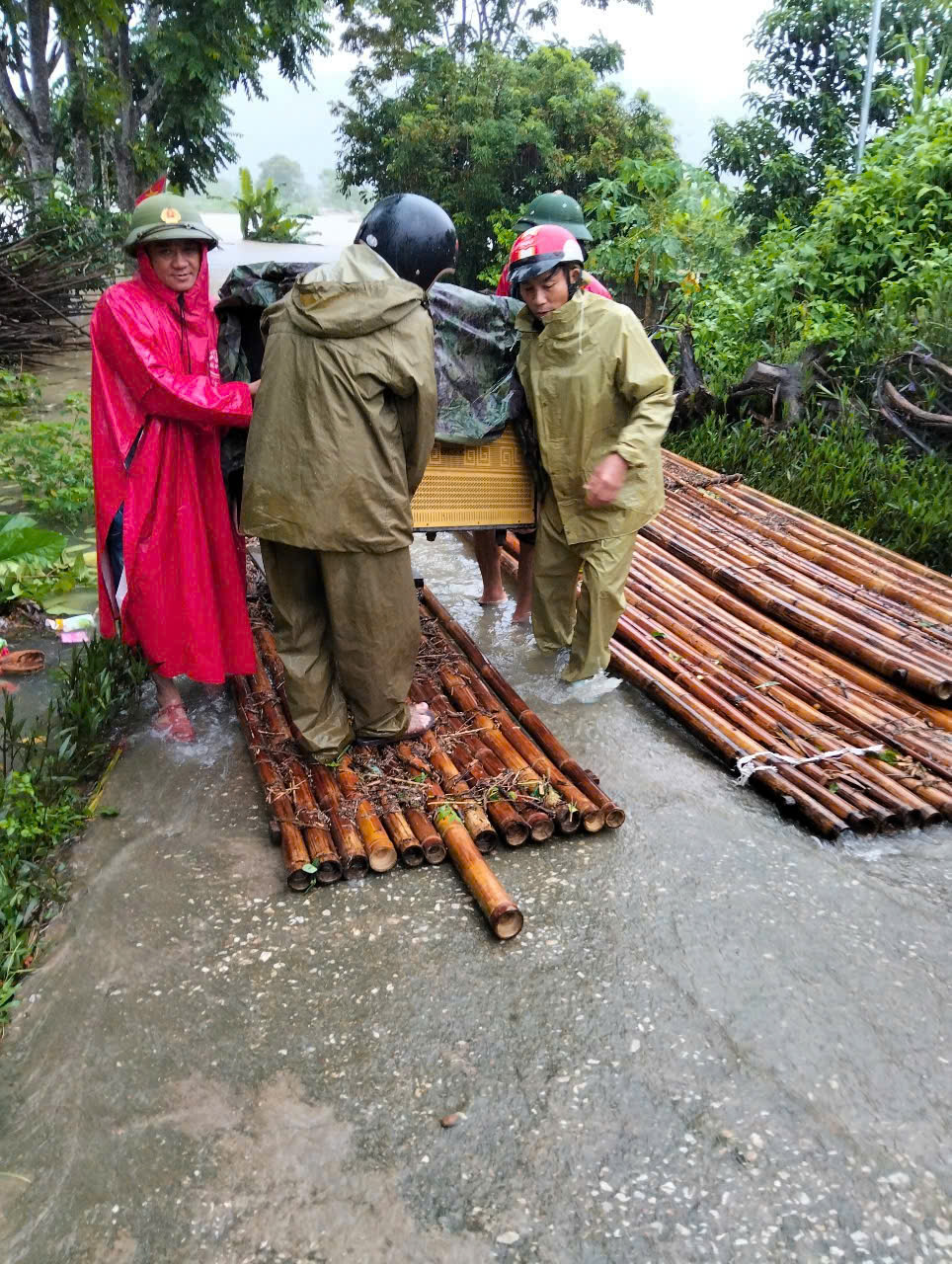 | Lực lượng Công an xã, an ninh cơ sở xã Châu Bình phối hợp người dân tiếp tục bám cơ sở, hỗ trợ bà con Nhân dân phòng, chống bão lũ |