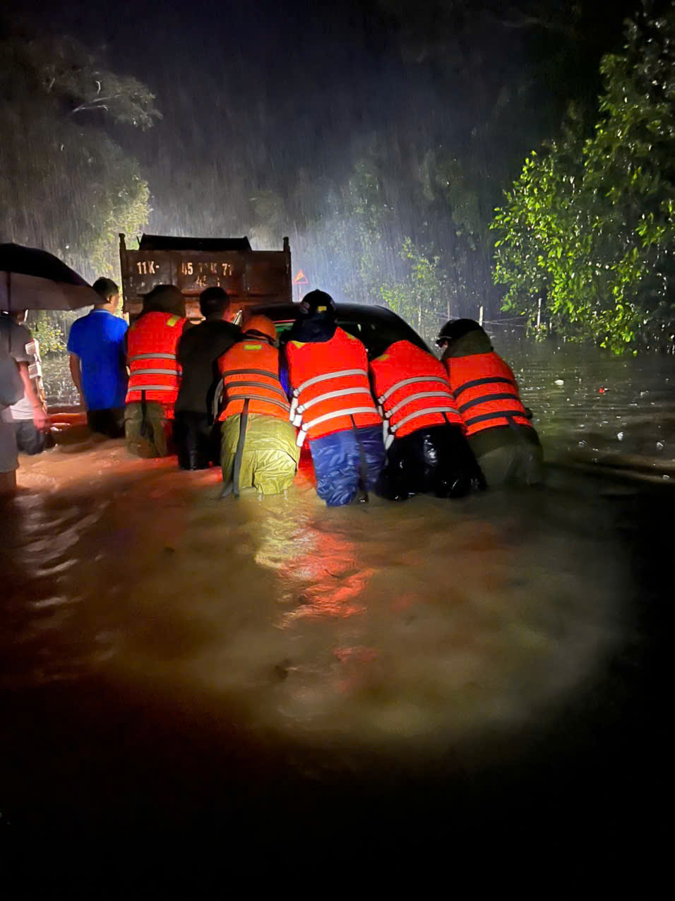 | Công an xã Quỳ Châu cùng người dân đẩy xe ô tô bị ngập lụt |