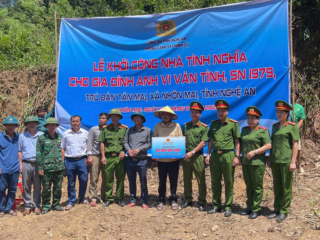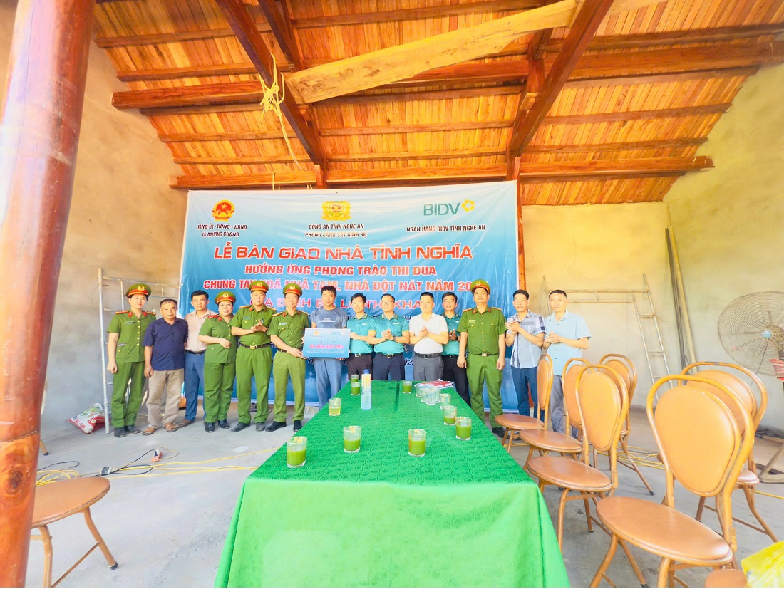 (congan.nghean.gov.vn)-Hưởng ứng Lời kêu gọi của Mặt trận Tổ quốc Việt Nam về “Vận động ủng hộ đồng bào khắc phục thiệt hại do mưa lũ” và thực hiện Chiến dịch 40 ngày đêm hoàn thành xây dựng trường học, trạm y tế dã chiến cùng 500 căn nhà tặng đồng bào Miền Tây Nghệ An của Bộ Công an, Phòng Cảnh sát hình sự Công an tỉnh Nghệ An đã phối hợp Ngân hàng BIDV chi nhánh Nghệ An vận động các nhà hảo tâm quyên góp kinh phí tiền mặt, quà và hỗ trợ xây dựng 03 căn nhà tặng bà con vùng lũ tại xã Nhôn Mai và xã Mường Chọng.