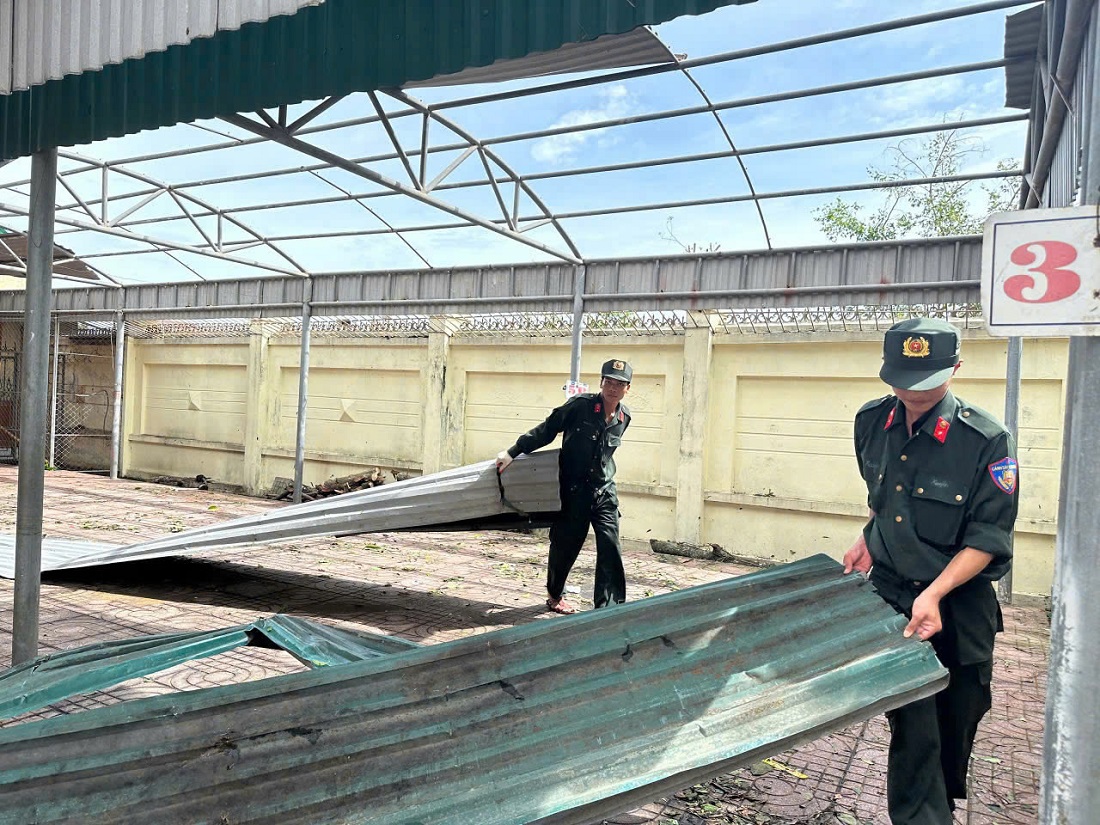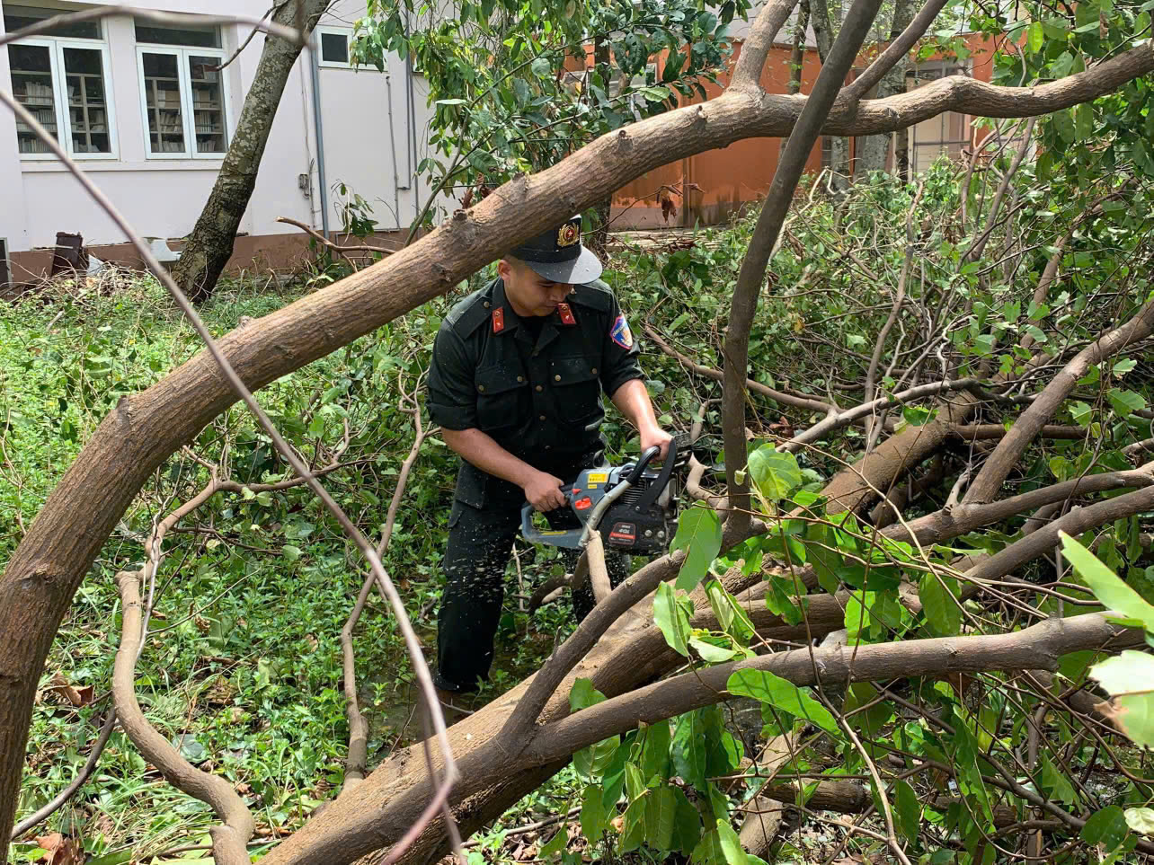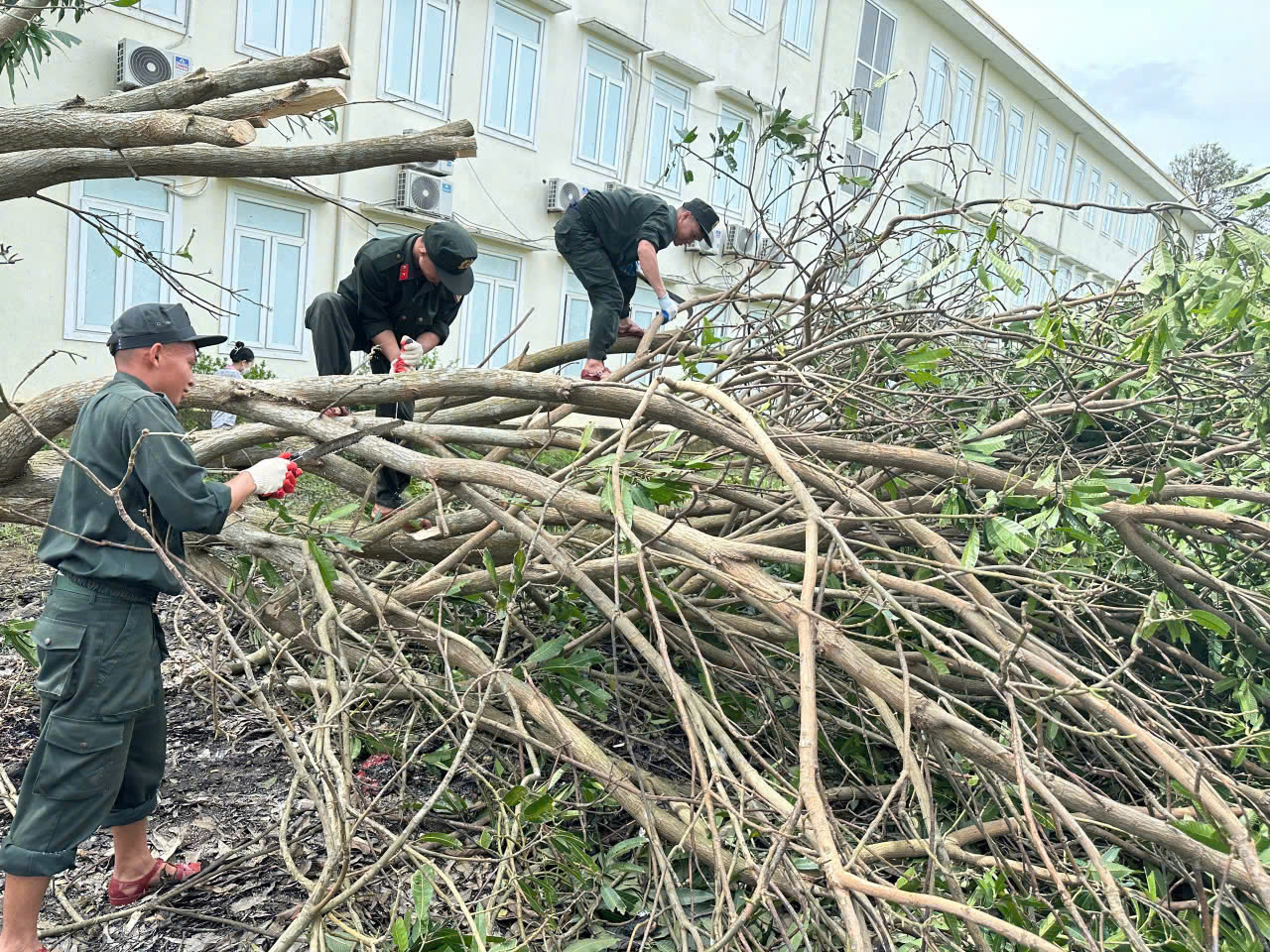 | Nhiều cây xanh bị gãy, đổ tại các trường học được cán bộ, chiến sĩ Trung đoàn Cảnh sát cơ động thu gom |