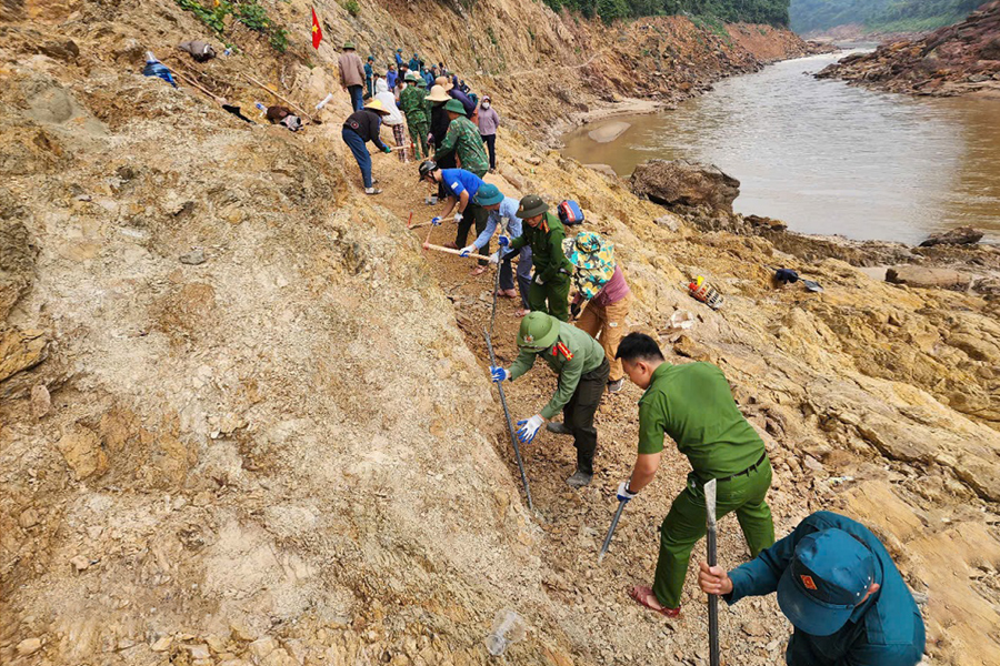 | Công an xã Mỹ Lý cùng các lực lượng đào đắp nền đường, đập đá, mở rộng những đoạn bị sạt lở nặng và mở mới một số đoạn để đảm bảo thông tuyến vào các khu dân cư |