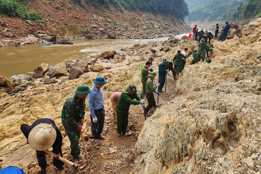 Lực lượng tham gia gồm: cán bộ, công chức xã, Công an xã, Đồn Biên phòng Mỹ Lý, lực lượng quân sự, Đoàn thanh niên, Trạm kiểm lâm, giáo viên của các điểm trường; Tổ an ninh cơ sở cùng đông đảo người dân của 12 bản. Các lực lượng phối hợp đào đắp nền đường, đập đá, mở rộng những đoạn bị sạt lở nặng và mở mới một số đoạn để đảm bảo thông tuyến vào khu dân cư.