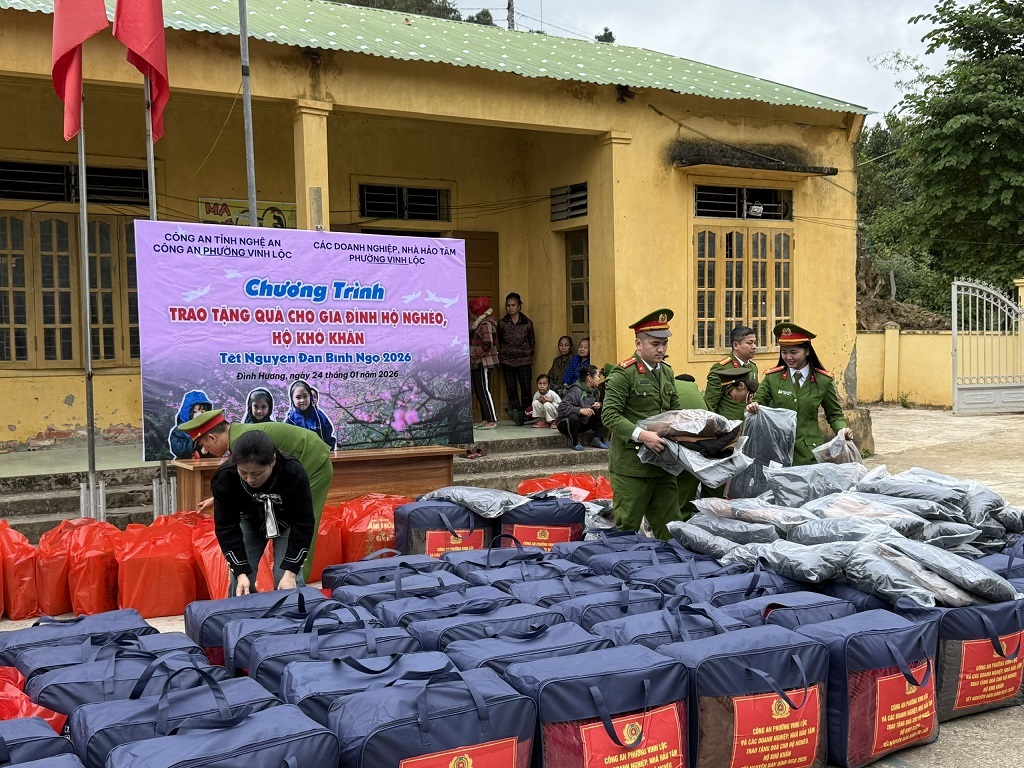 (Congan.nghean.gov.vn)-Công an phường Vinh Lộc vừa phối hợp nhà hảo tâm, doanh nghiệp tổ chức chương trình trao 80 suất quà Tết tặng hộ gia đình nghèo, gia đình có hoàn cảnh khó khăn tại bản Đình Hương, xã Tam Quang, tỉnh Nghệ An.
