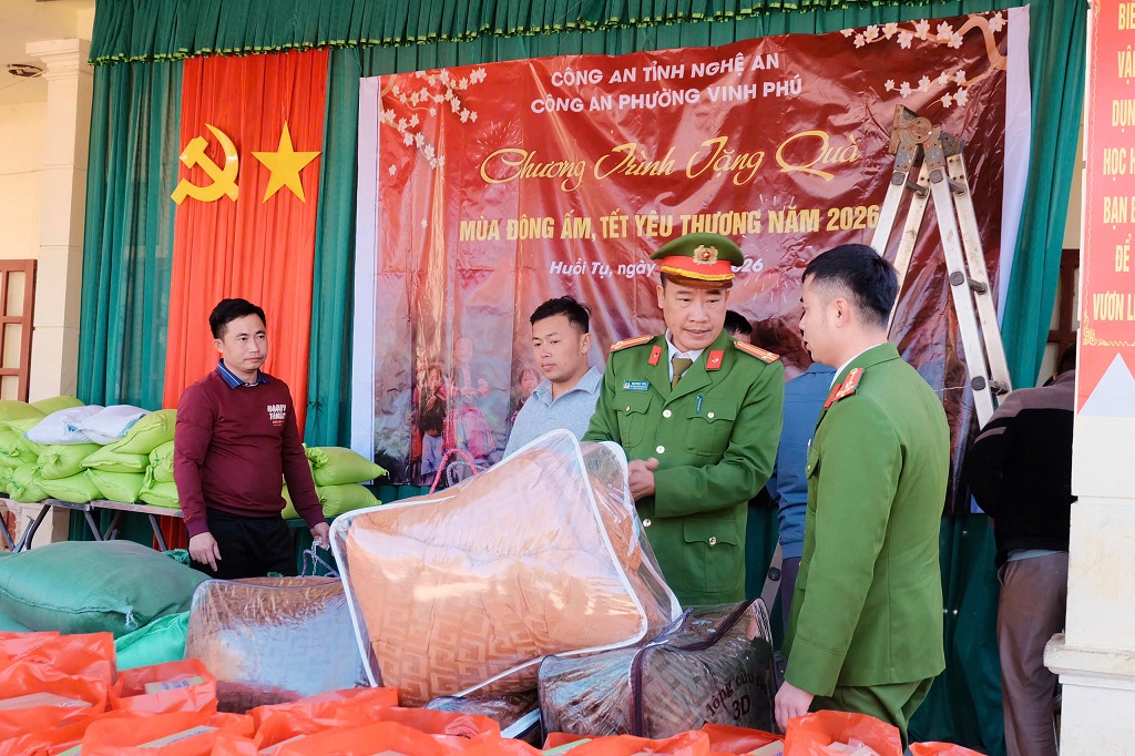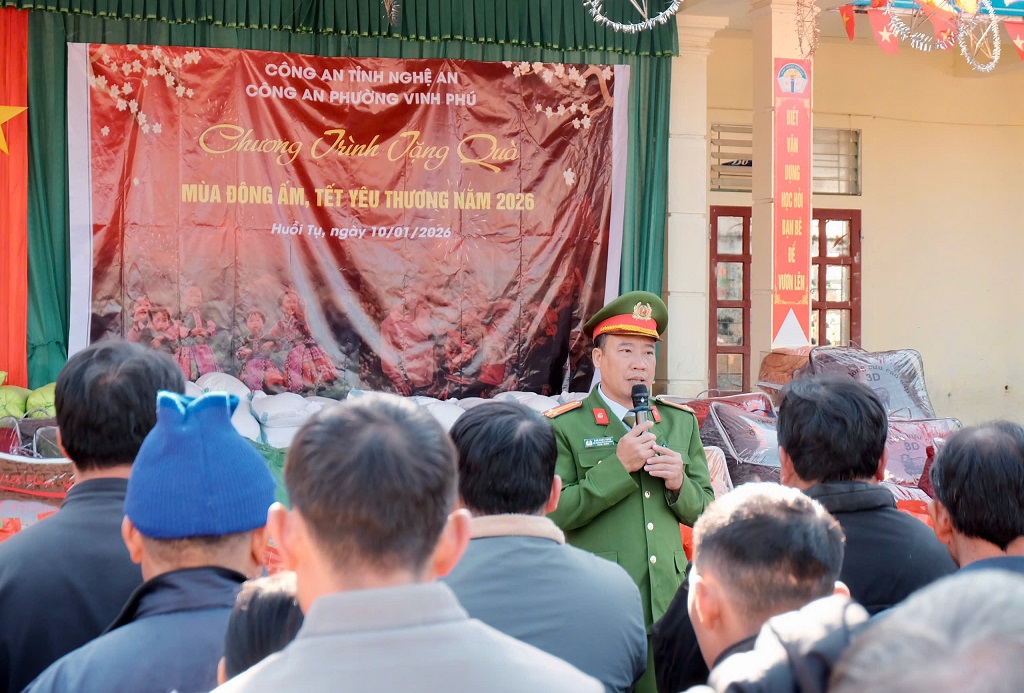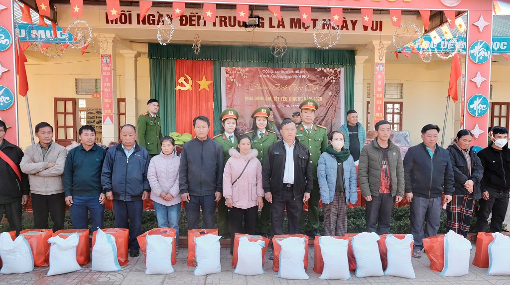 Tại chương trình, Công an phường trao 500 suất quà tặng hộ dân của xã Huồi Tụ có hoàn cảnh khó khăn, bị ảnh hưởng nặng nề bởi thiên tai. Mỗi suất quà gồm nhu yếu phẩm phục vụ sinh hoạt hằng ngày như: chăn ấm, mì tôm, gạo, dầu ăn, nước mắm, muối và một số vật dụng sinh hoạt khác. Đây là tấm lòng, tình cảm, sự sẻ chia kịp thời của Công an phường Vinh Phú đối với đồng bào vùng cao.