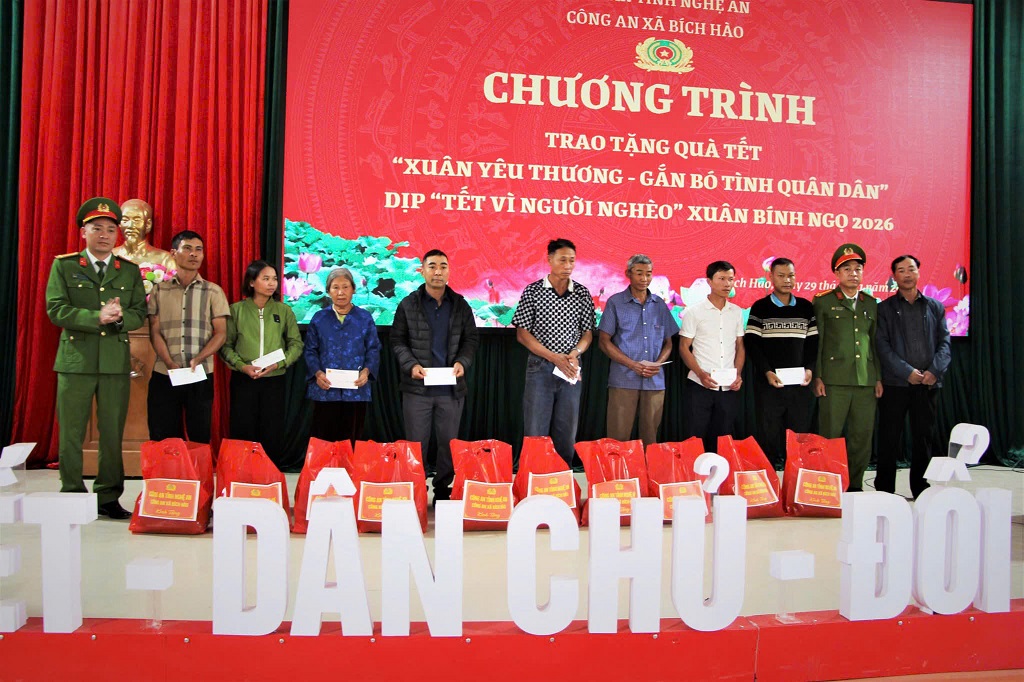 (Congan.nghean.gov.vn)-Nhằm sẻ chia, động viên hộ nghèo, hộ cận nghèo, gia đình chính sách và những hoàn cảnh đặc biệt khó khăn, Công an xã Bích Hào tổ chức chương trình “Xuân yêu thương - Gắn bó tình quân dân”.
