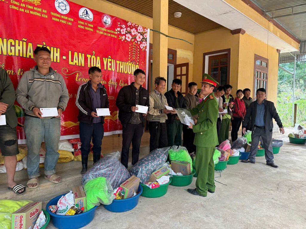 (Congan.nghean.gov.vn)-Công an xã Mường Xén phối hợp với Trường Mầm non Hạnh Phúc LHS, Công ty TNHH Hồng Trường và nhà hảo tâm tổ chức chương trình “Xuân nghĩa tình - lan tỏa yêu thương”.