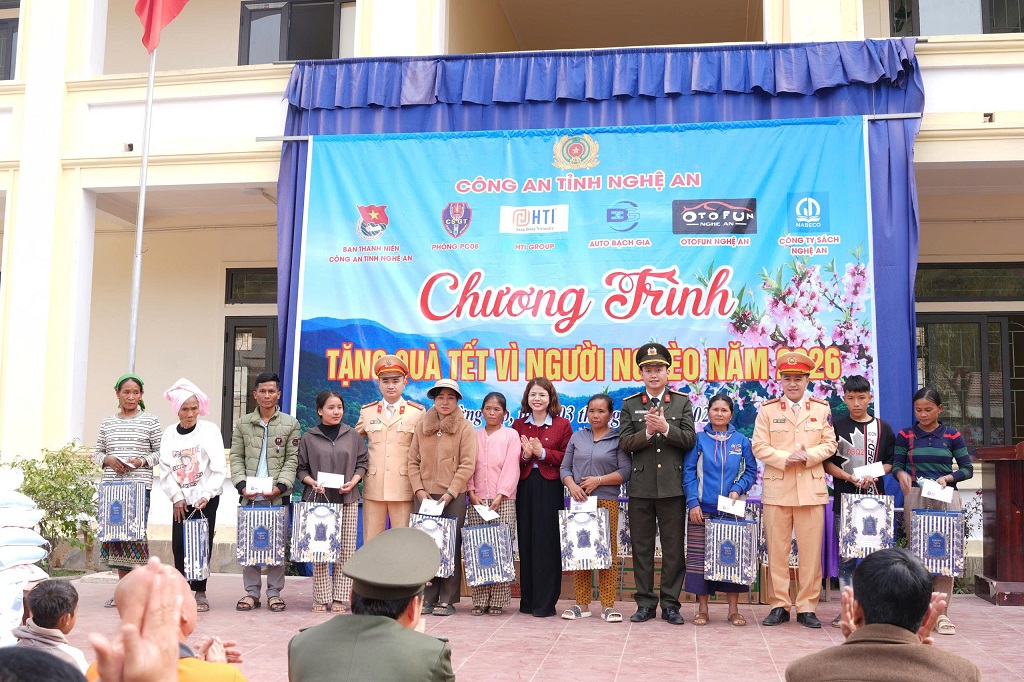(Congan.nghean.gov.vn)-Hưởng ứng chương trình Tết vì người nghèo năm 2026, chiều 03/02, đoàn công tác do Ban Thanh niên Công an tỉnh chủ trì, phối hợp với Phòng Cảnh sát giao thông và đơn vị tài trợ tổ chức trao quà tặng hộ gia đình có hoàn cảnh khó khăn tại xã Mường Típ. Tham dự chương trình có đại diện Lãnh đạo Phòng Công tác chính trị và chính quyền địa phương.
