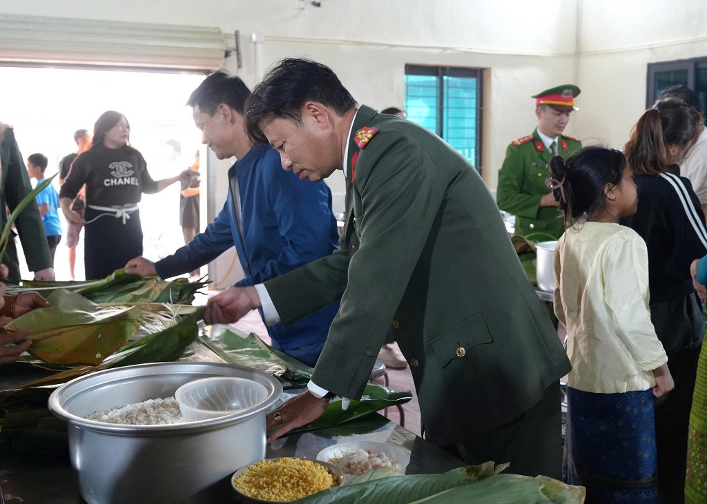 | Sau phần trao quà, đại biểu “vui gói bánh chưng” với thầy, cô Trường Tiểu học Mường Típ 2 nhân dịp Tết đến Xuân về |