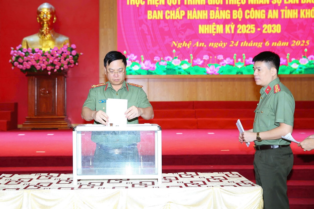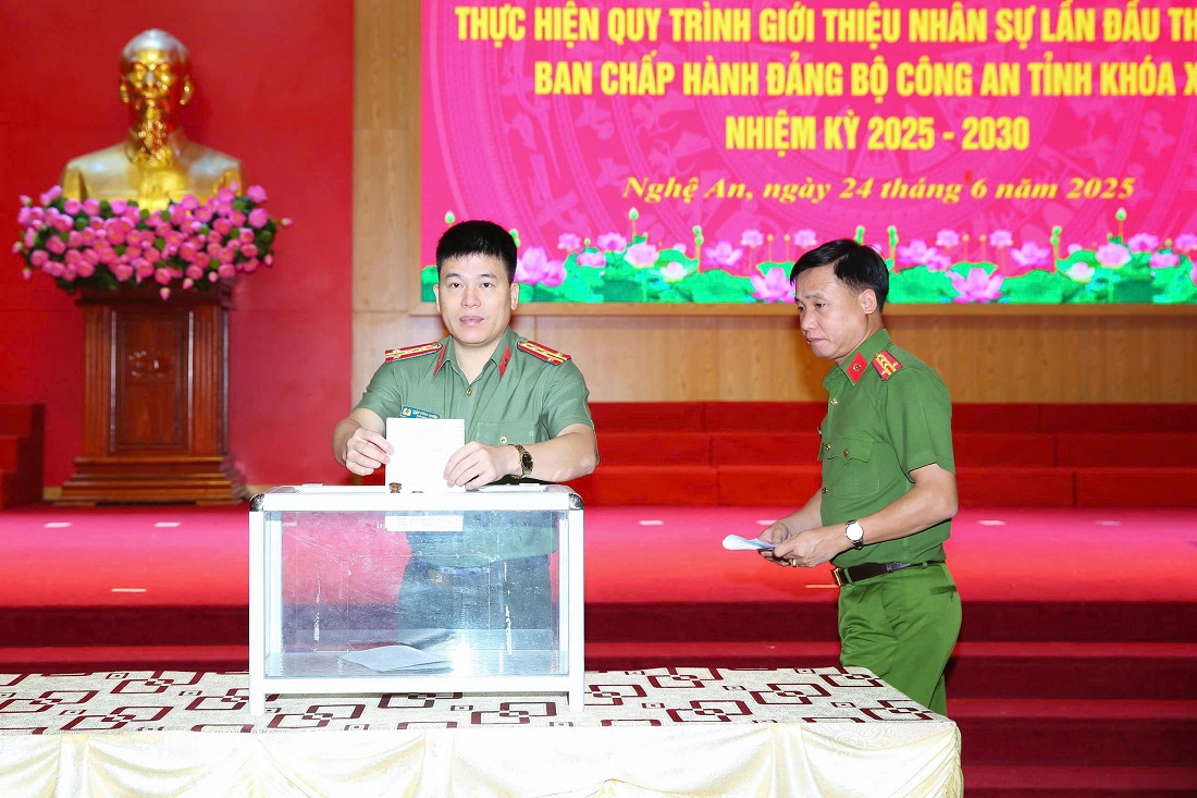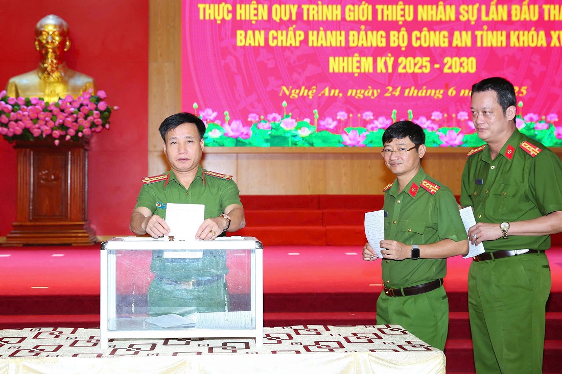 (Congan.nghean.gov.vn)-Thực hiện hướng dẫn của Đảng ủy Công an Trung ương và Ban Thường vụ Tỉnh ủy về công tác quy hoạch, bổ sung nhân sự cấp ủy nhiệm kỳ mới, sáng 24/6/2025, Đảng ủy Công an tỉnh tổ chức các Hội nghị để thực hiện quy trình giới thiệu nhân sự lần đầu tham gia Ban Chấp hành Đảng bộ, Ủy ban kiểm tra Đảng ủy Công an tỉnh khóa XV, nhiệm kỳ 2025-2030.