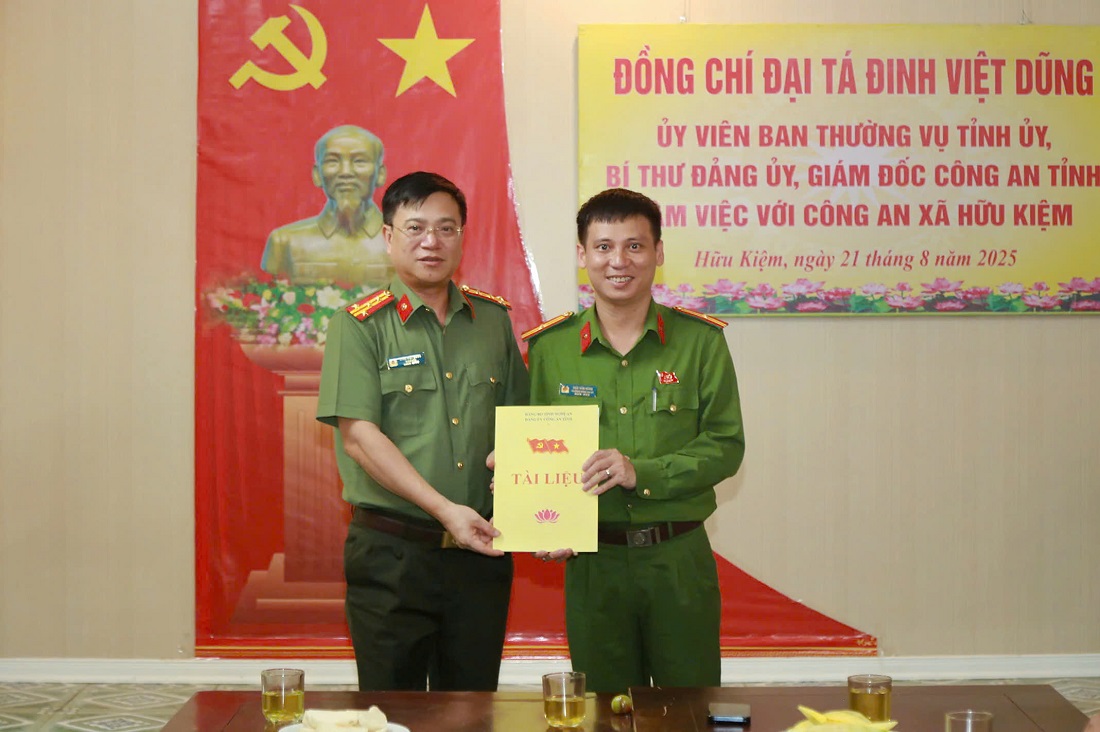 (Congan.nghean.gov.vn)-Chiều 21/8/2025, đồng chí Đại tá Đinh Việt Dũng, Ủy viên Ban Thường vụ Tỉnh ủy, Bí thư Đảng ủy, Giám đốc Công an tỉnh có buổi thăm, làm việc với tập thể Chỉ huy và cán bộ, chiến sĩ Công an xã Hữu Kiệm.