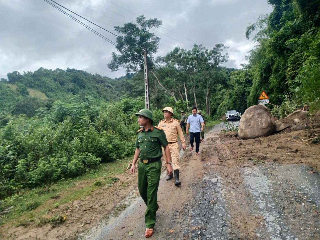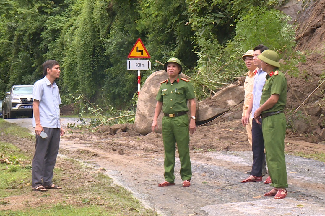 | Đồng chí Đại tá Nguyễn Duy Thanh, Phó Giám đốc Công an tỉnh kiểm tra các địa điểm sạt lở trên tuyến Quốc lộ 7 |