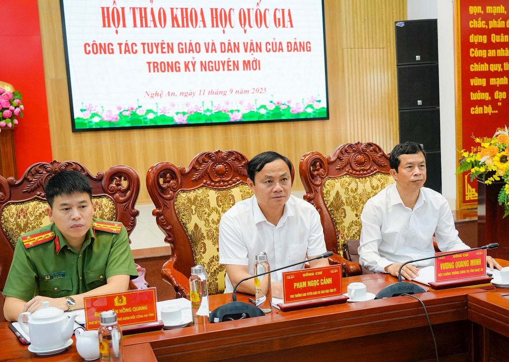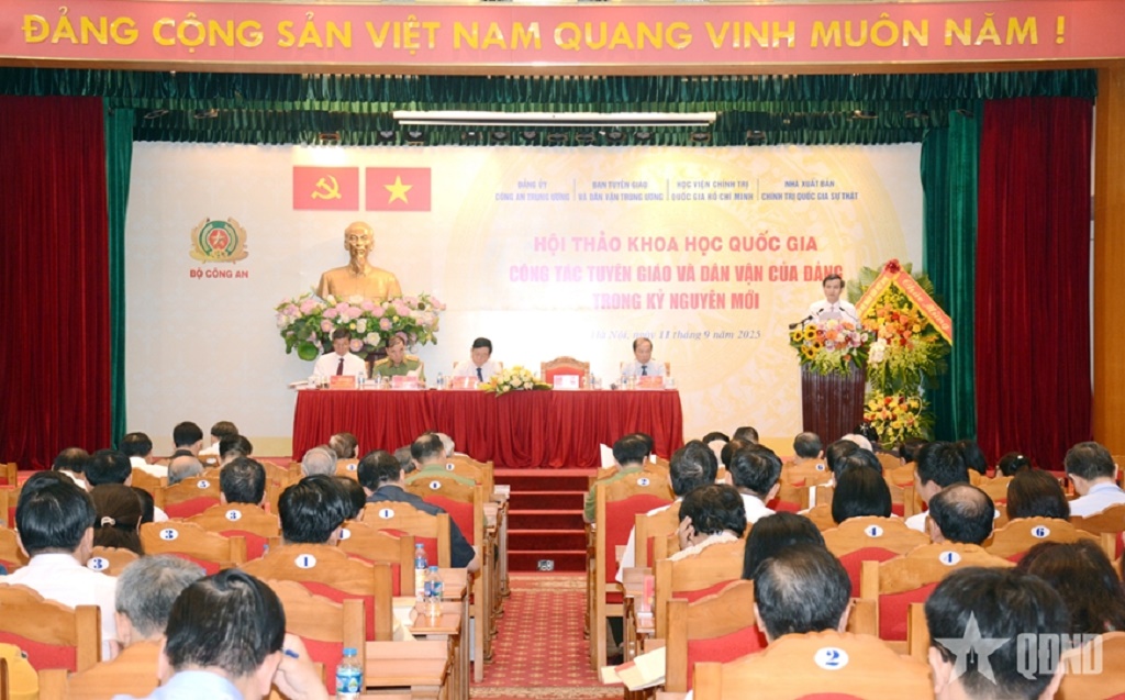 (Congan.nghean.gov.vn)-Chiều 11/9/2025, tại Hà Nội, Đảng ủy Công an Trung ương, Học viện Chính trị quốc gia Hồ Chí Minh, Ban Tuyên giáo và Dân vận Trung ương và Nhà Xuất bản Chính trị quốc gia Sự thật phối hợp tổ chức Hội thảo khoa học quốc gia “Công tác tuyên giáo và dân vận của Đảng trong kỷ nguyên mới”.
