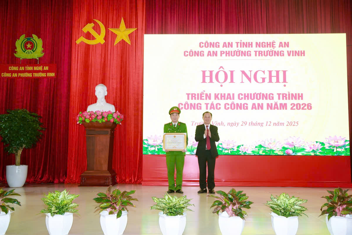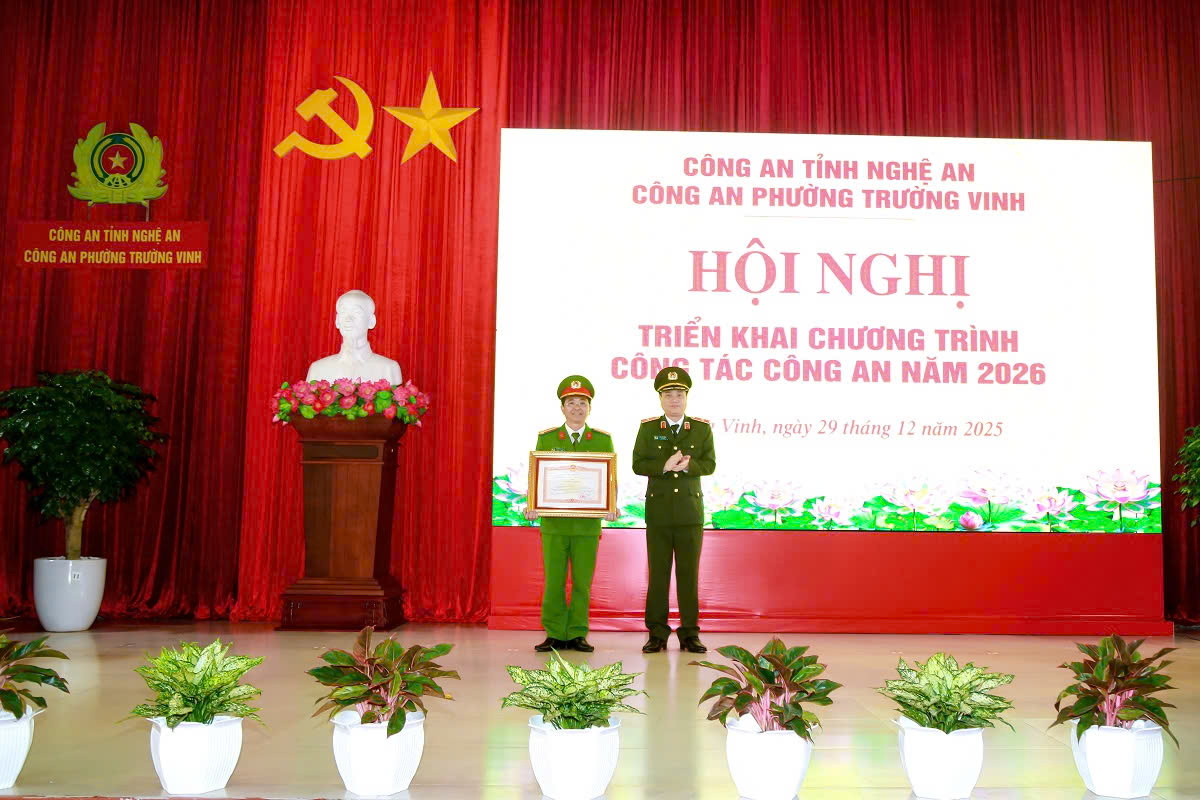 (Congan.nghean.gov.vn)-Sáng 29/12/2025, Công an phường Trường Vinh tổ chức hội nghị triển khai công tác công an năm 2026. Dự và chỉ đạo Hội nghị có đồng chí Thiếu tướng Đinh Việt Dũng- Ủy viên Ban Thường vụ Tỉnh ủy, Bí thư Đảng uỷ, Giám đốc Công an tỉnh; đồng chí Phan Đức Đồng - Ủy viên Ban thường vụ Tỉnh uỷ- Bí thư Đảng ủy - Chủ tịch HĐND phường Trường Vinh; đại diện các phòng thuộc Công an tỉnh, Viện Kiểm sát nhân dân tỉnh, Toà án nhân dân khu vực 1 và toàn thể cán bộ, chiến sĩ Công an phường.