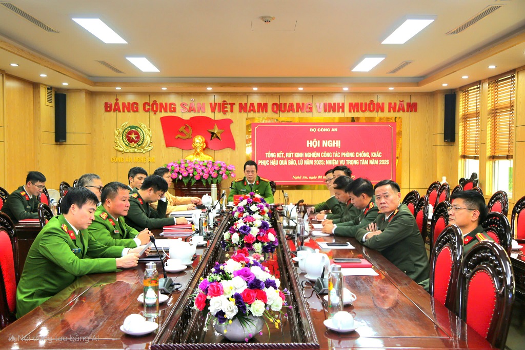 (Congan.nghean.gov.vn)-Chiều 08/12/2025, tại Hà Nội, Bộ Công an tổ chức Hội nghị tổng kết, rút kinh nghiệm công tác phòng, chống, khắc phục hậu quả bão, lũ năm 2025; triển khai nhiệm vụ trọng tâm năm 2026 theo hình thức trực tiếp tại Hội trường Bộ Công an và trực tuyến đến Công an các đơn vị, địa phương.