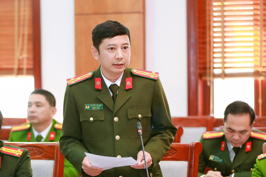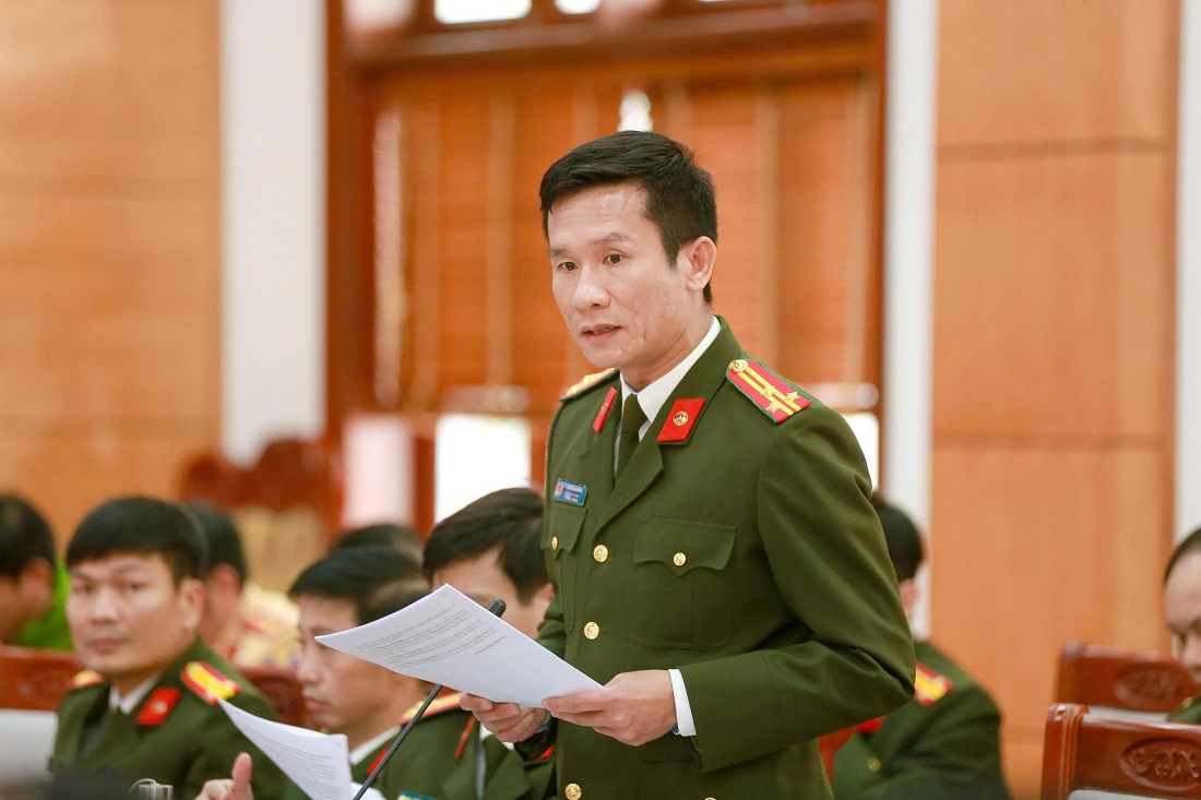 | Đồng chí Thượng tá Phạm Thành Long, Phó Giám đốc Công an tỉnh phát biểu tại Hội nghị |
