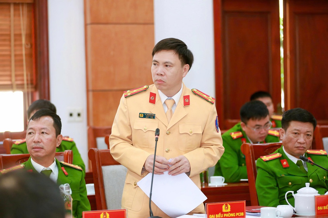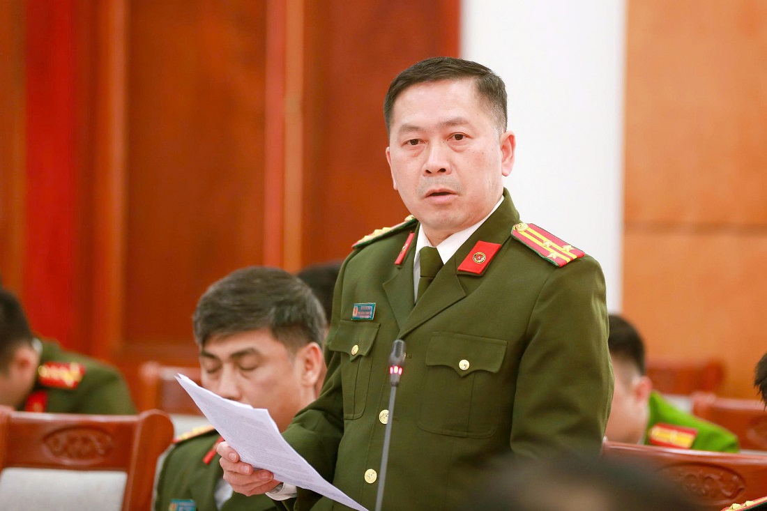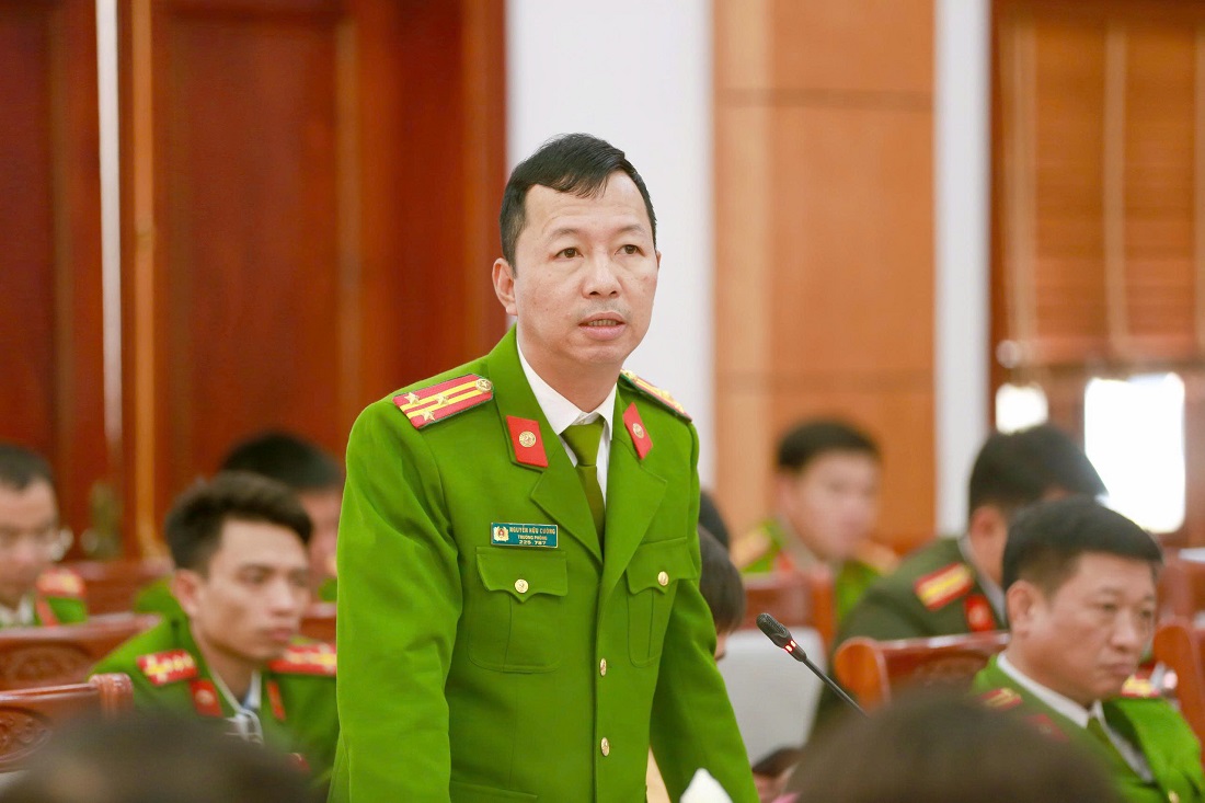 | Đồng chí Đại tá Nguyễn Đức Cường, Phó Giám đốc Công an tỉnh phát biểu tại Hội nghị |