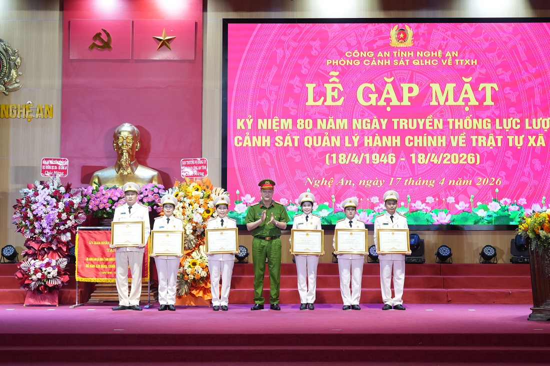 Tại buổi lễ, nhiều tập thể, cá nhân lực lượng Cảnh sát Quản lý hành chính về trật tự xã hội Công an Nghệ An được Bộ Công an, UBND tỉnh và Giám đốc Công an tỉnh khen thưởng về thành tích xuất sắc trong công tác và phong trào thi đua kỷ niệm 80 năm Ngày truyền thống lực lượng Cảnh sát Quản lý hành chính về trật tự xã hội.