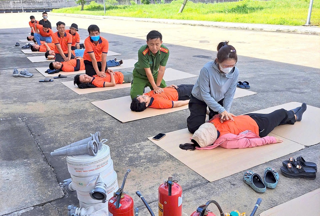 | Cán bộ PCCC&CNCH hướng dẫn kỹ thuật thoát hiểm và sơ cứu nạn nhân trong tình huống cháy, nổ giả định |
