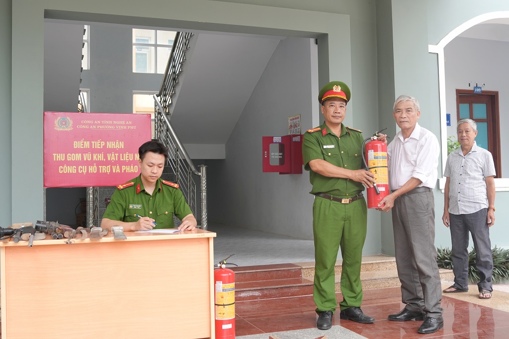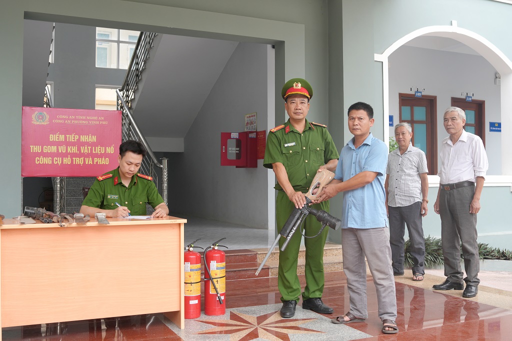 | Bên cạnh tập trung đấu tranh với tội phạm, vi phạm pháp luật về vũ khí, vật liệu nổ, công cụ hỗ trợ và pháo, Công an phường Vinh Phú còn chú trọng tuyên truyền, vận động người dân giao nộp vũ khí, vật liệu nổ, công cụ hỗ trợ |