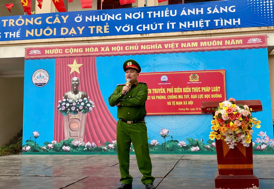 Tại buổi tuyên truyền, Công an phường Hoàng Mai trực tiếp truyền đạt nhiều nội dung thiết thực, gần gũi với lứa tuổi học sinh, tập trung vào một số chuyên đề như: trật tự an toàn giao thông; phòng, chống bạo lực học đường; tác hại của ma túy và phòng ngừa tệ nạn xã hội.