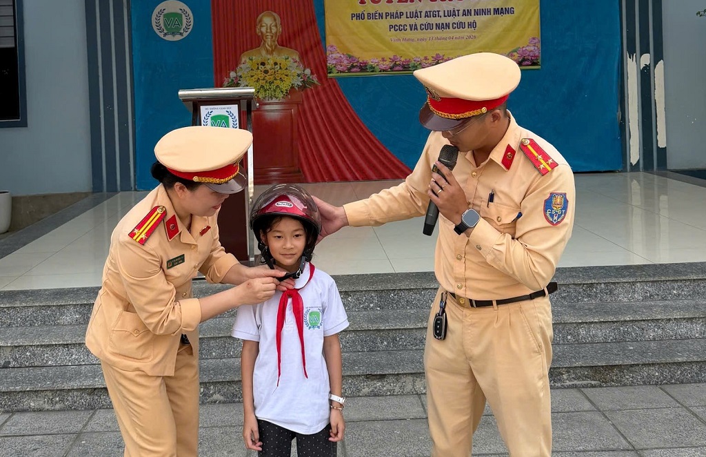 (Congan.nghean.gov.vn)-Ngày 13/4/2026, Công an phường Vinh Hưng phối hợp với Đội CSGT số 4, Phòng Cảnh sát giao thông Công an tỉnh Nghệ An tổ chức chương trình tuyên truyền pháp luật về trật tự an toàn giao thông, an ninh mạng và kỹ năng bảo đảm an toàn phòng cháy, chữa cháy tại Trường Tiểu học, THCS, THPT Việt Anh.