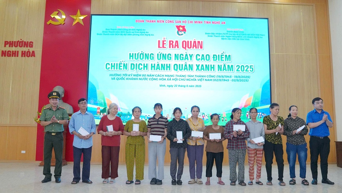Tại Lễ ra quân, Ban Thanh niên Công an tỉnh phối hợp với Đoàn thanh niên Ngân hàng BIDV chi nhánh Nghệ An đã trao biển hỗ trợ sửa chữa nhà trị giá 50 triệu đồng cho ông Phạm Văn Chung, hộ nghèo đang sinh sống tại khối 6, phường Nghi Tân. Cùng với đó, trao 30 suất quà tặng 15 gia đình có hoàn cảnh khó khăn và 15 học sinh nghèo vượt khó học tốt.