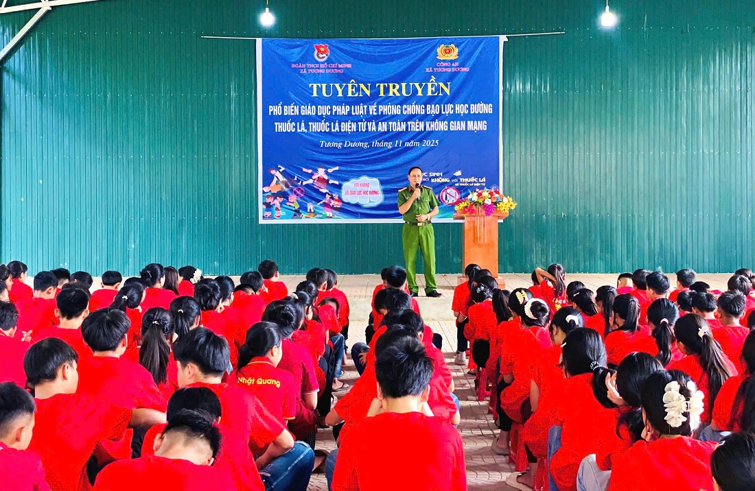(Congan.nghean.gov.vn)-Chiều 10/11, tại Trường THCS Xá Lượng, Công an xã Tương Dương phối hợp với Đoàn Thanh niên xã tổ chức buổi tuyên truyền, phổ biến, giáo dục pháp luật về phòng chống bạo lực học đường; thuốc lá, thuốc lá điện tử và an toàn trên không gian mạng cho học sinh.