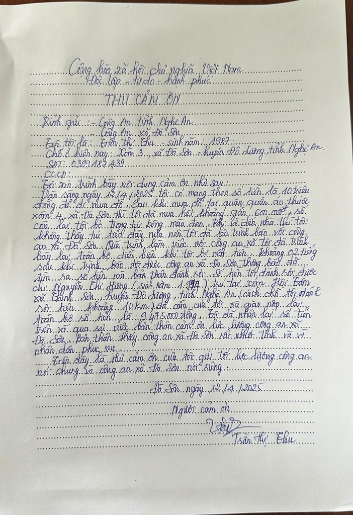 (Congan.nghean.gov.vn)-Công an xã Đà Sơn, huyện Đô Lương cho biết vừa nhận được thư cảm ơn của chị Trần Thị Thu (SN 1987) trú trên địa bàn sau khi được lực lượng Công an giúp tìm lại tài sản bị mất.