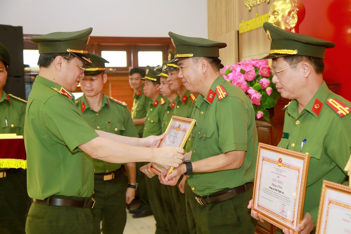 | Đồng chí Đại tá Nguyễn Đức Cường, Phó Giám đốc Công an tỉnh trao Giấy khen của Giám đốc Công an tỉnh đến các tập thể đạt thành tích xuất sắc |