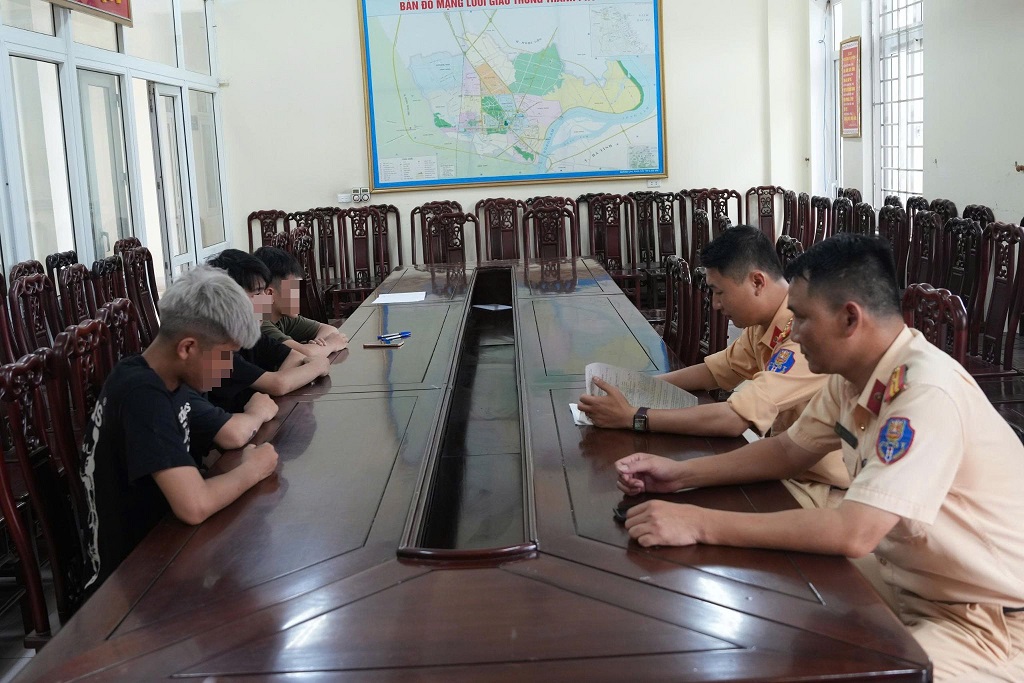 Theo đó, qua công tác nắm tình hình và tổ chức tuần tra lưu động, vào khoảng 01 giờ 30 phút ngày 26/7/2025, Tổ Cảnh sát giao thông địa bàn thuộc Đội Cảnh sát giao thông đường bộ số 4, Phòng Cảnh sát giao thông Công an tỉnh Nghệ An đã phát hiện, bắt giữ nhóm đối tượng gồm: Trần Văn T. (sinh ngày 02/10/2007); Trần Nhật A. (sinh ngày 2/12/2006), đều trú tại phường Cửa Lò; L.M.L., (sinh năm 2010), trú tại phường Trường Vinh và Trần Đình Qu. (sinh năm 2005), trú tại xã Tân Kỳ có hành vi điều khiển xe mô tô tháo, che biển số, lạng lách đánh võng, chạy tốc độ cao mang theo dao phóng lợn, kiếm, vỏ chai bia đi trên các tuyến đường, như: 72m, Lê Nin, Nguyễn Du, Lê Duẩn, Trường Thi, Hồ Tùng Mậu… gây mất trật tự an toàn giao thông, làm ảnh hưởng đến an ninh trật tự và người tham gia giao thông.
