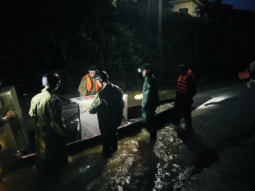 | Công an xã Lượng Minh hỗ trợ di chuyển người và tài sản đến vùng an toàn |