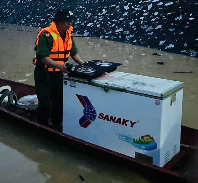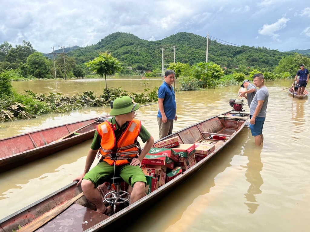 | Công an xã Tam Thái chèo thuyền tiếp tế lương thực, nước uống đến tận tay các hộ dân di dời và cô lập. |