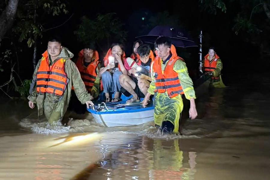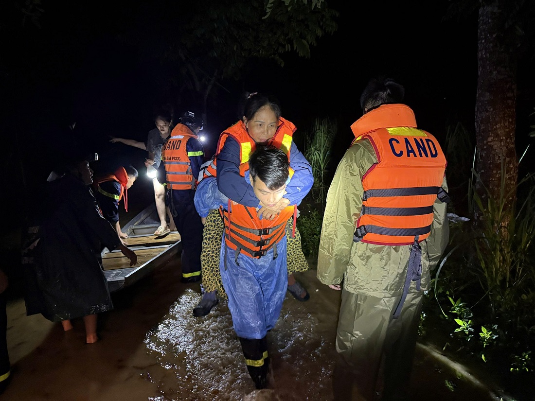Lực lượng cứu hộ đã vượt nước sâu, lần lượt đưa từng người dân cùng tài sản ra khỏi khu vực nguy hiểm đến nơi an toàn.