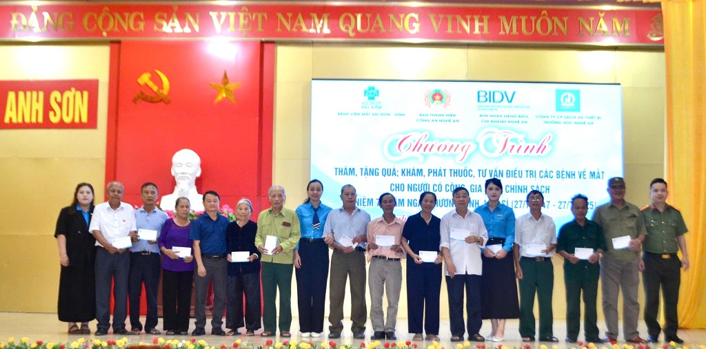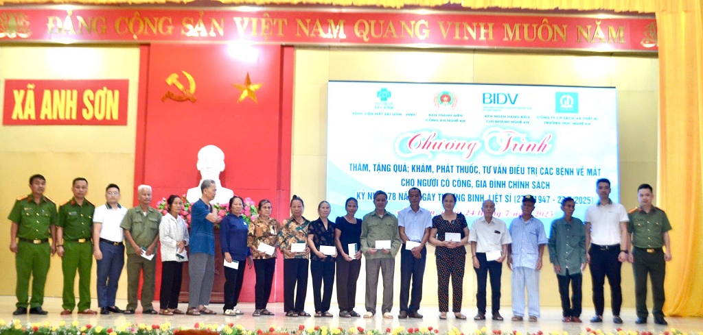 (Congan.nghean.gov.vn)-Hướng đến kỷ niệm 78 năm Ngày Thương binh - Liệt sĩ (27/7/1947 - 27/7/2025), ngày 24/7, Công an tỉnh Nghệ An phối hợp Bệnh viện mắt Sài Gòn - Vinh, Ngân hàng BIDV chi nhánh Nghệ An và Công ty Cổ phần sách và thiết bị trường học tổ chức chương trình thăm, tặng quà và khám, phát thuốc, tư vấn điều trị các bệnh về mắt cho người có công, gia đình chính sách trên địa bàn xã Anh Sơn, tỉnh Nghệ An.