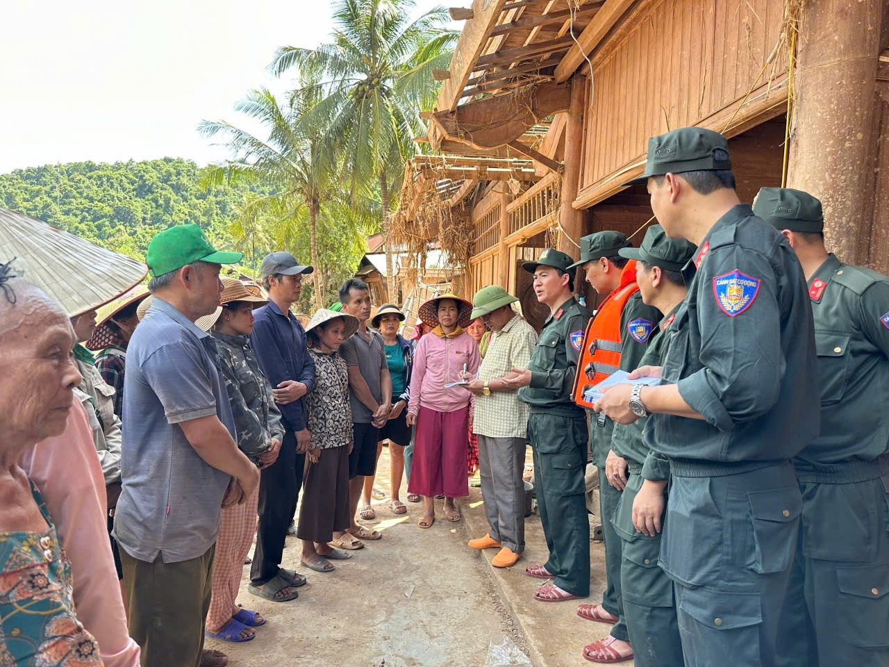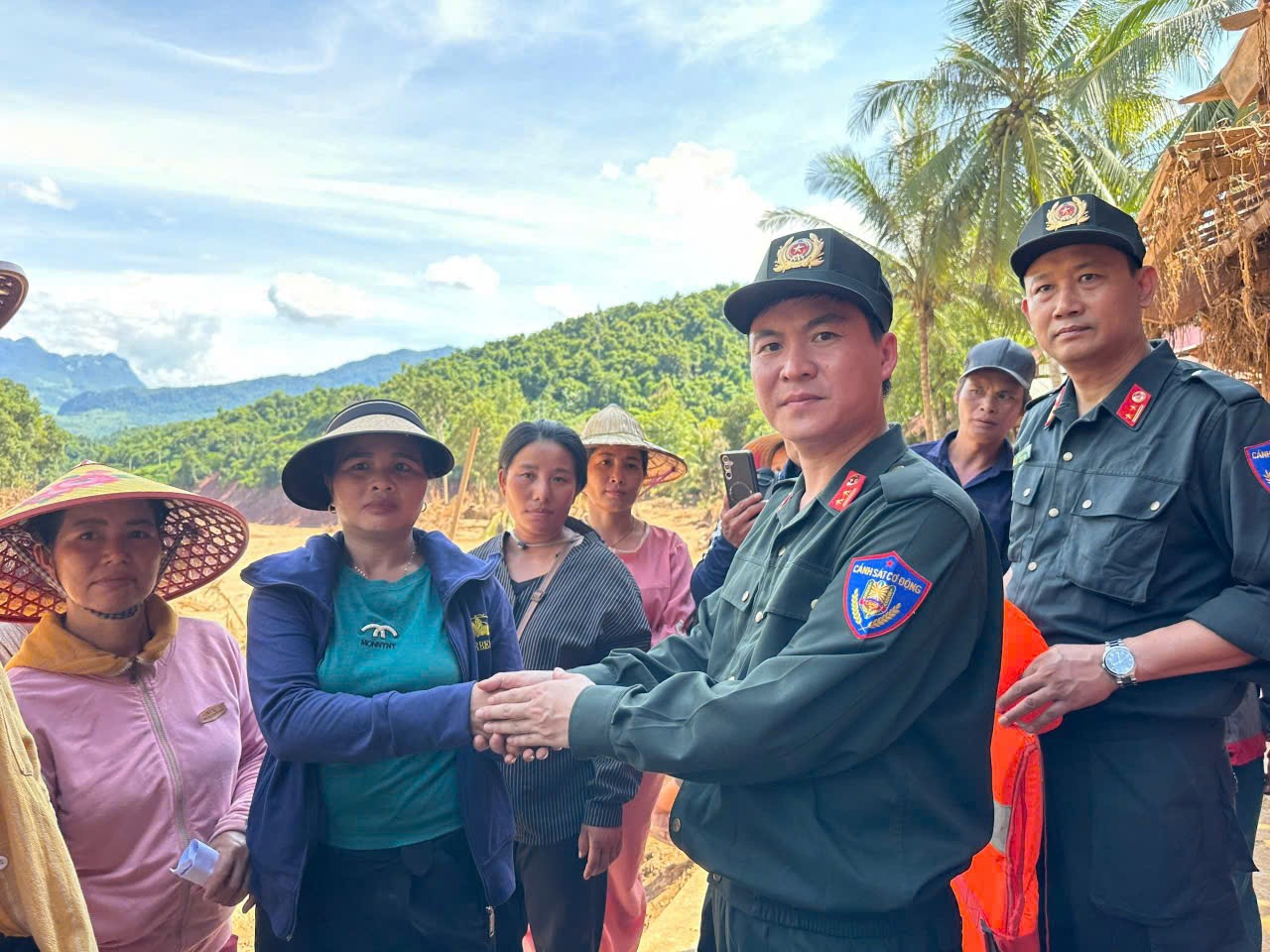 | Trung tá Ngô Anh Tuấn - Trưởng Phòng Cảnh sát cơ động làm trưởng Đoàn có mặt trực tiếp tại bản Xiềng Trên, xã Mỹ Lý động viên bà con Nhân dân và các trường học bị ảnh hưởng do mưa lũ |
