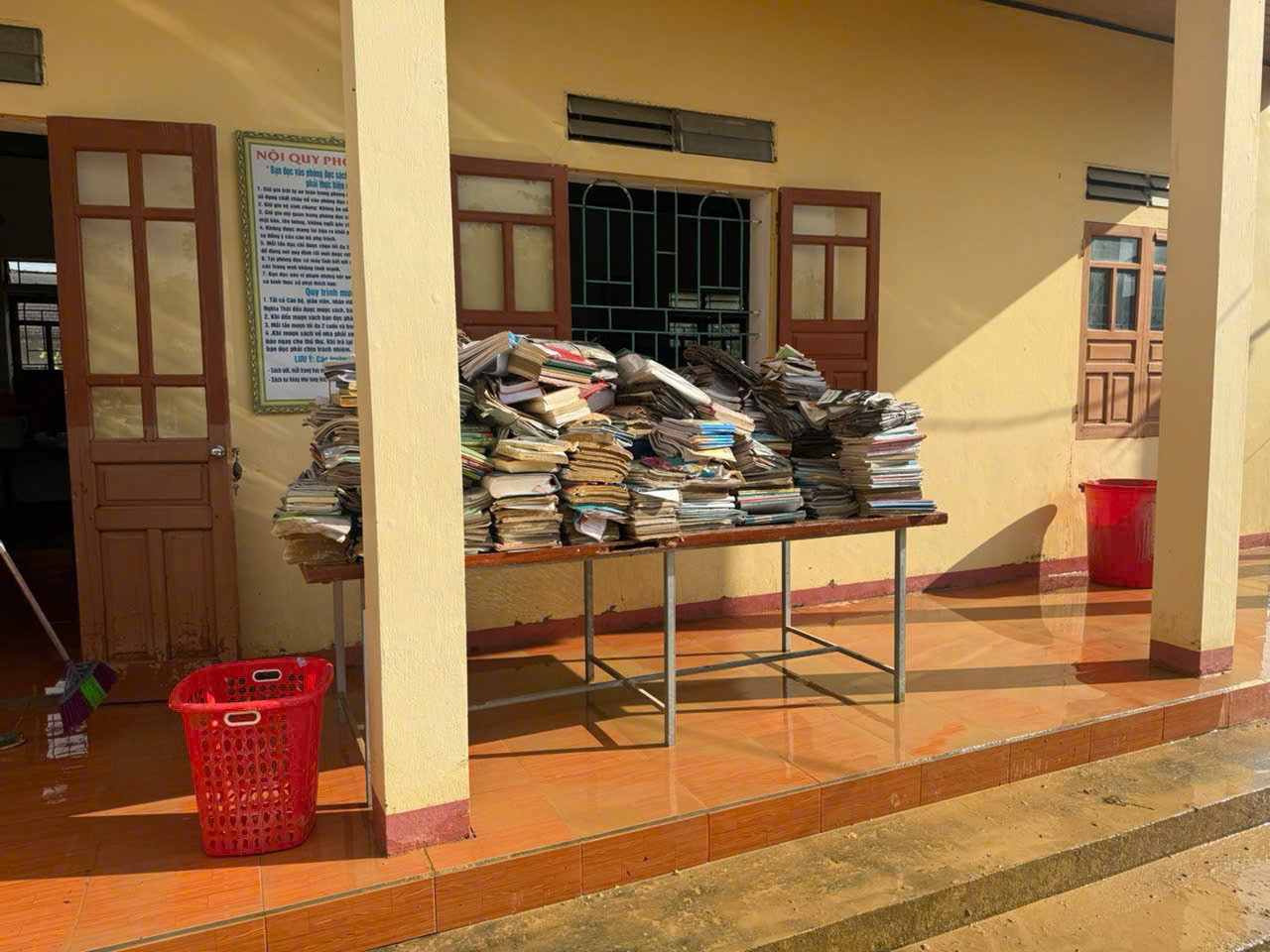 | Phòng học ngập nước và đồ dụng học tập bị hư hỏng |