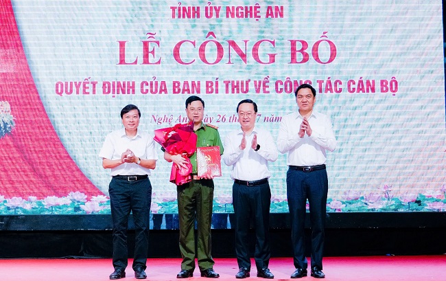 Đồng chí Trưởng ban Tổ chức Tỉnh ủy đã công bố Quyết định số 2240-QĐNS/TW, ngày 15/7/2025 của Ban Bí thư Trung ương Đảng về việc chỉ định đồng chí Đại tá Đinh Việt Dũng - Giám đốc Công an tỉnh tham gia Ban Chấp hành, Ban Thường vụ Tỉnh ủy Nghệ An nhiệm kỳ 2020-2025. Tại buổi lễ, đồng chí Bí thư Tỉnh ủy Nguyễn Đức Trung đã trao Quyết định của Ban Bí thư Trung ương Đảng cho đồng chí Đinh Việt Dũng; các đồng chí trong Thường trực Tỉnh ủy, Ban Thường vụ Tỉnh ủy cũng đã tặng hoa chúc mừng.