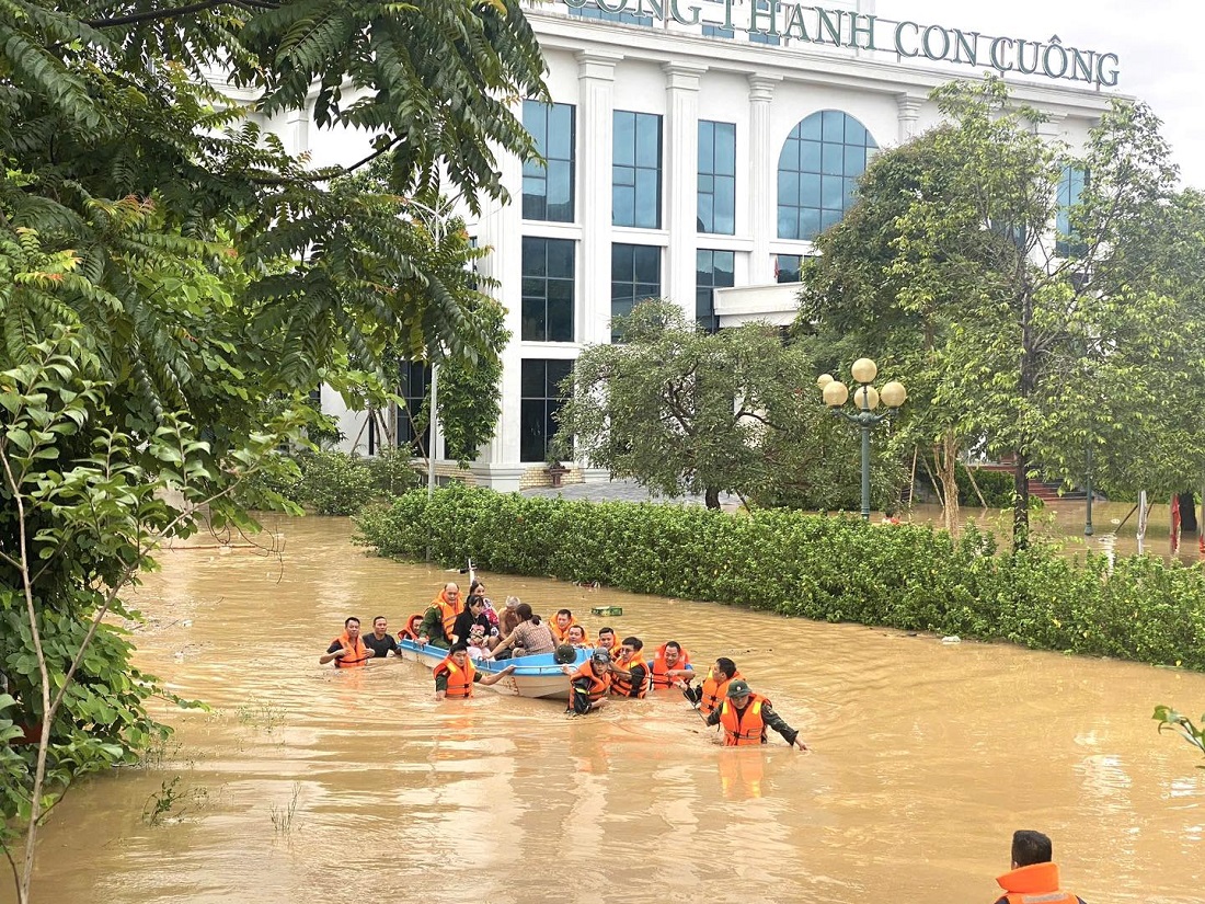 | Lực lượng Công an, quân sự huy động thuyền để sơ tán và tiếp tế lương thực cho người dân bị cô lập |