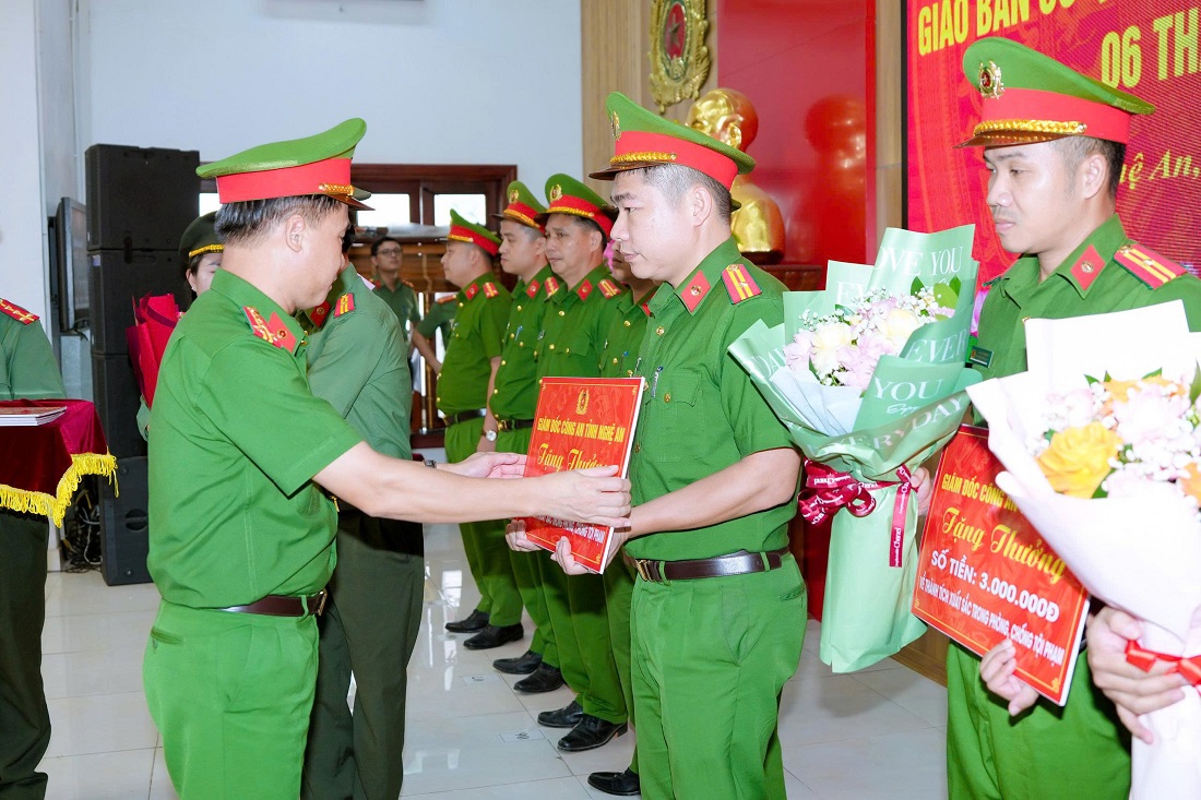 | Đồng chí Đại tá Nguyễn Duy Thanh, Phó Giám đốc, Thủ trưởng Cơ quan CSĐT Công an tỉnh trao thưởng các đơn vị có thành tích xuất sắc |