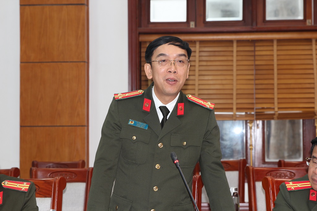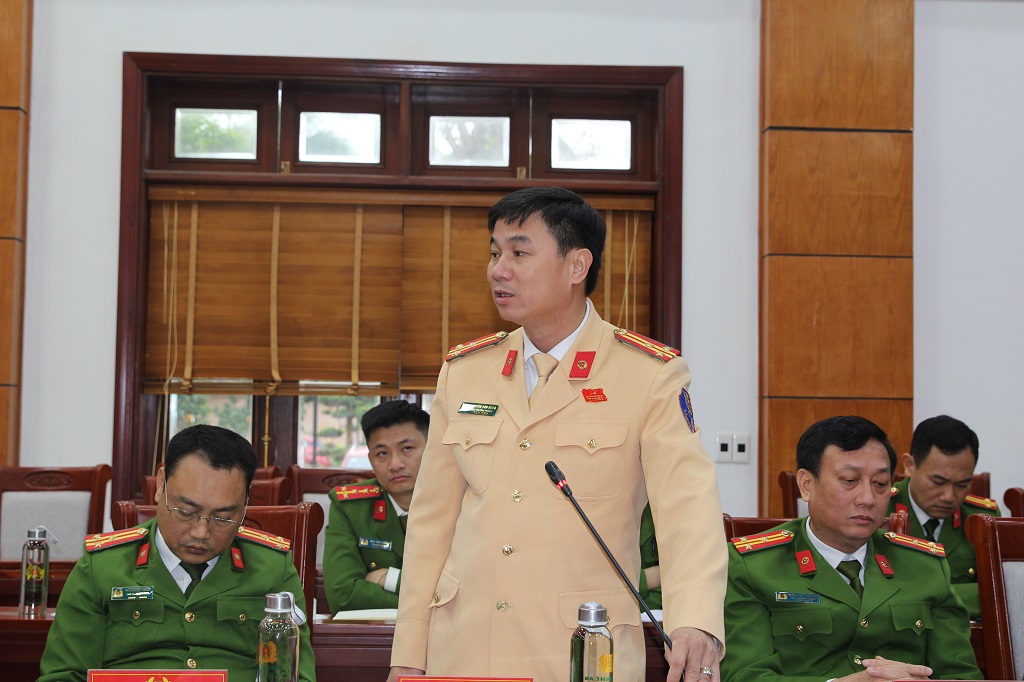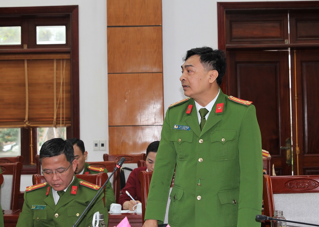 | Đồng chí Đại tá Trần Hồng Quang, Phó Giám đốc Công an tỉnh phát biểu tại cuộc họp |